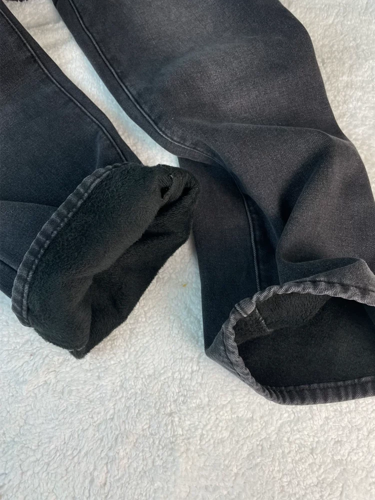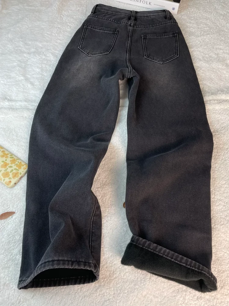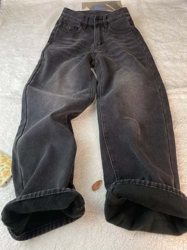 - Quần jean ống thẳng dày lót lông cừu dành cho nữ, phong cách thu đông, cỡ lớn, lưng cao, dáng rộng, tôn dáng, dáng quả lê, quần ống rộng.