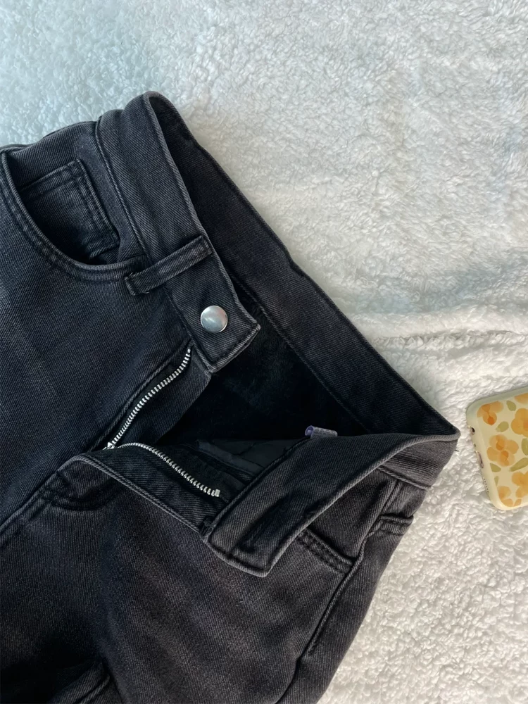 Quần jean ống thẳng dày lót lông cừu dành cho nữ, phong cách thu đông, cỡ lớn, lưng cao, dáng rộng, tôn dáng, dáng quả lê, quần ống rộng.