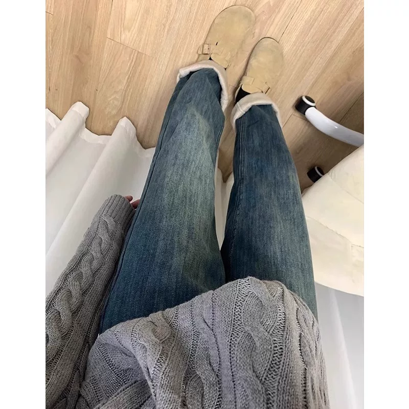 - Quần jean ống thẳng dày lót lông màu xanh cổ điển dành cho nữ, kiểu dáng mùa đông mới, cỡ lớn, cạp cao, che hông, quần ống rộng giúp thon gọn.