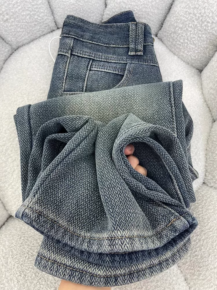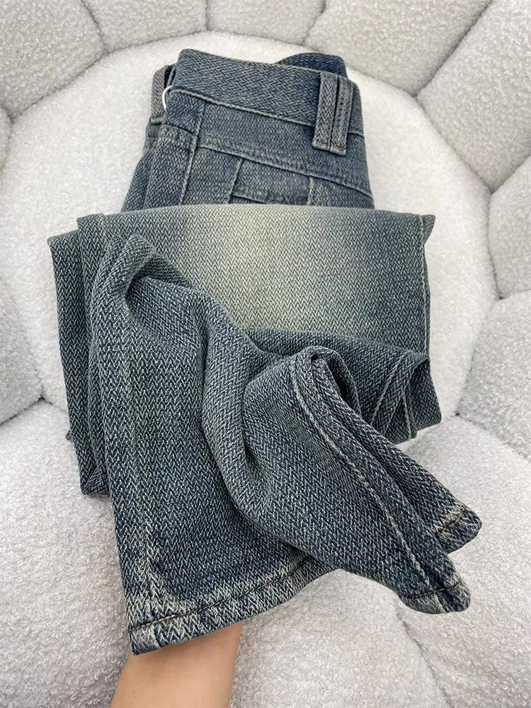 - Quần jean ống thẳng họa tiết ngôi sao màu xanh cổ điển dành cho nữ, đầu thu, cỡ lớn, lưng cao, dáng rộng, che hông, giảm béo, quần ống rộng