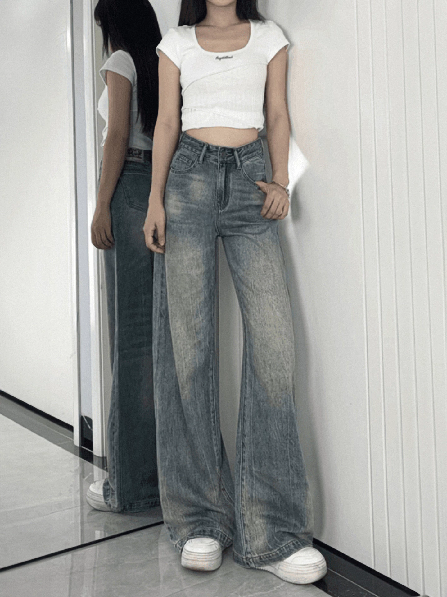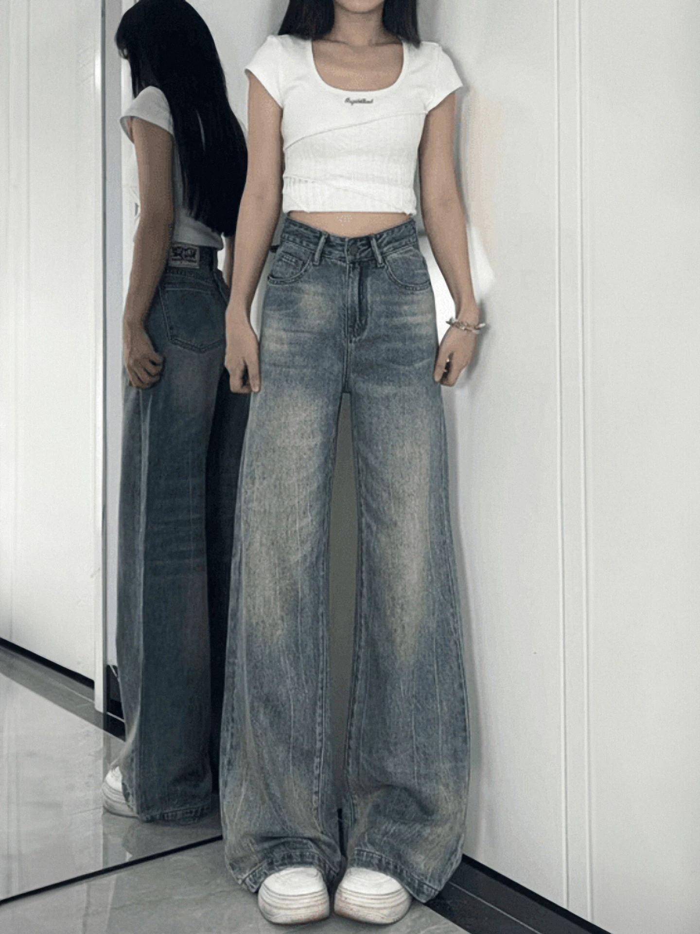 - Quần jean ống thẳng kiểu Mỹ cổ điển dành cho nữ, phong cách mùa thu mới, cỡ lớn, lưng cao, dáng rộng, tôn dáng, phong cách lười biếng, quần ống rộng.