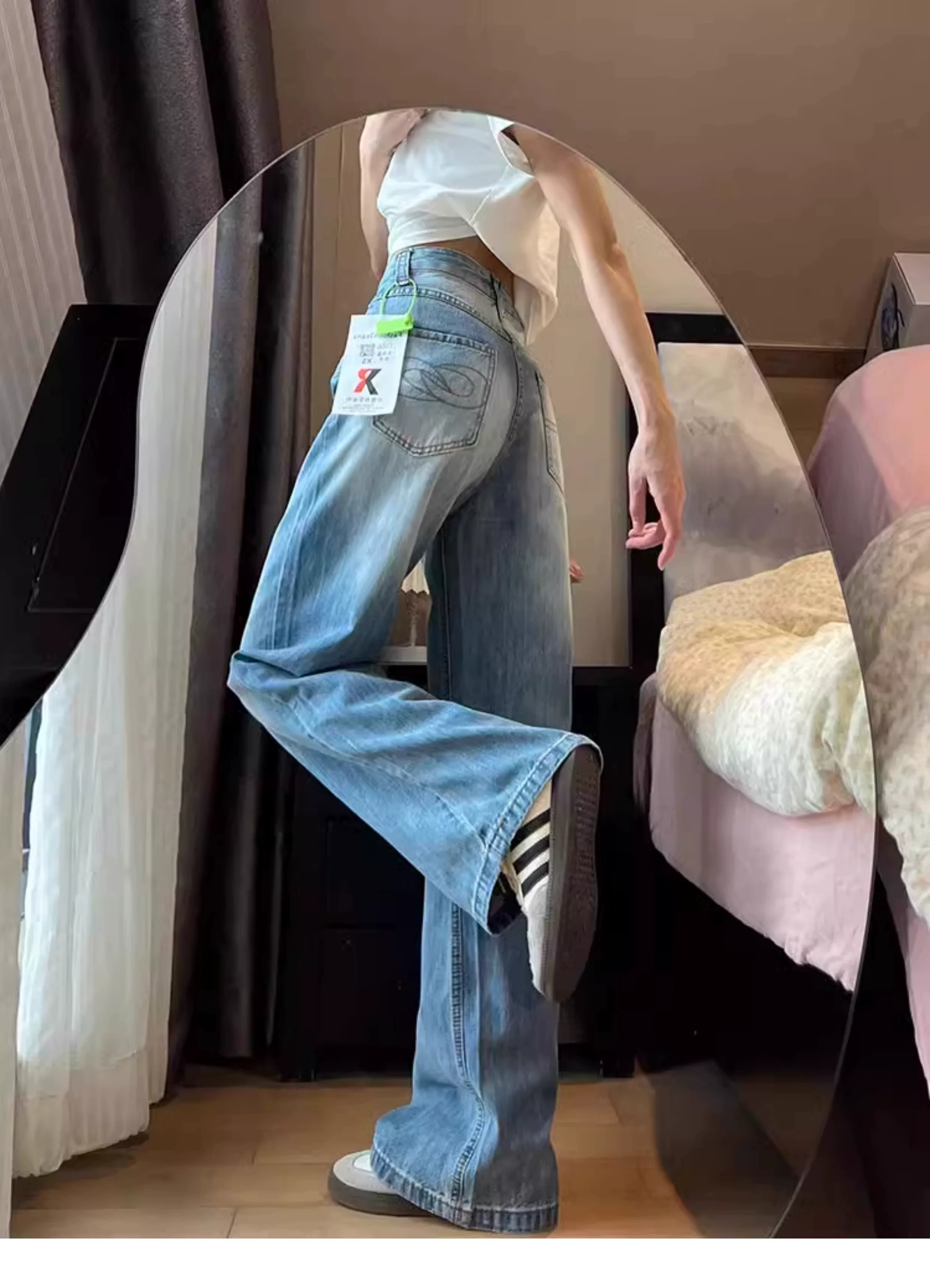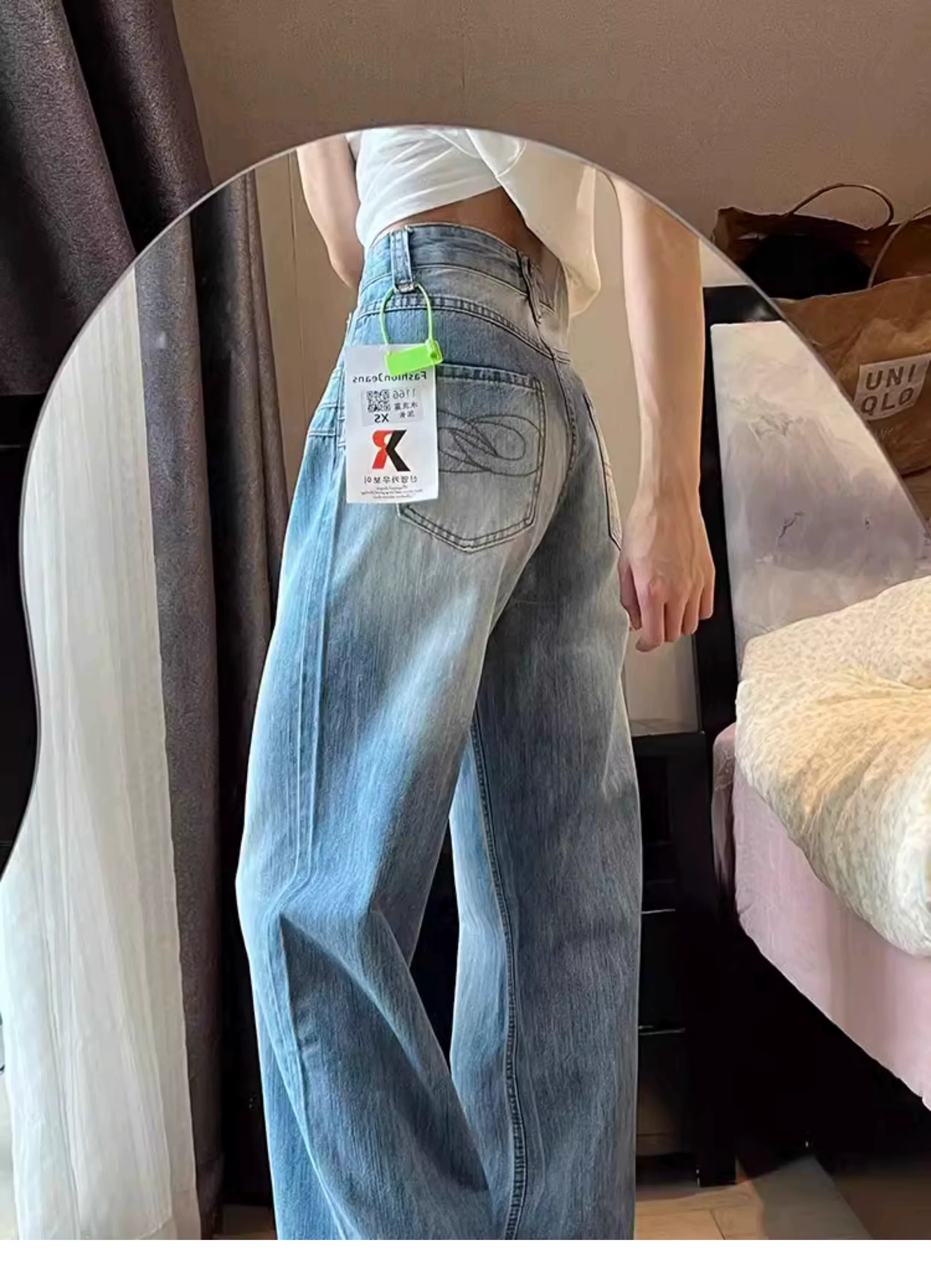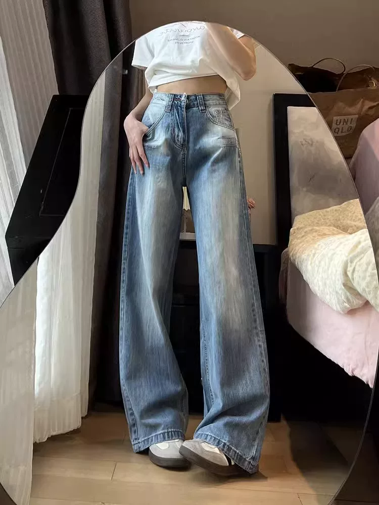 Quần jean ống thẳng kiểu Mỹ dành cho nữ, cỡ lớn, thiết kế mới đầu thu, lưng cao, dáng rộng, quần ống rộng giảm béo