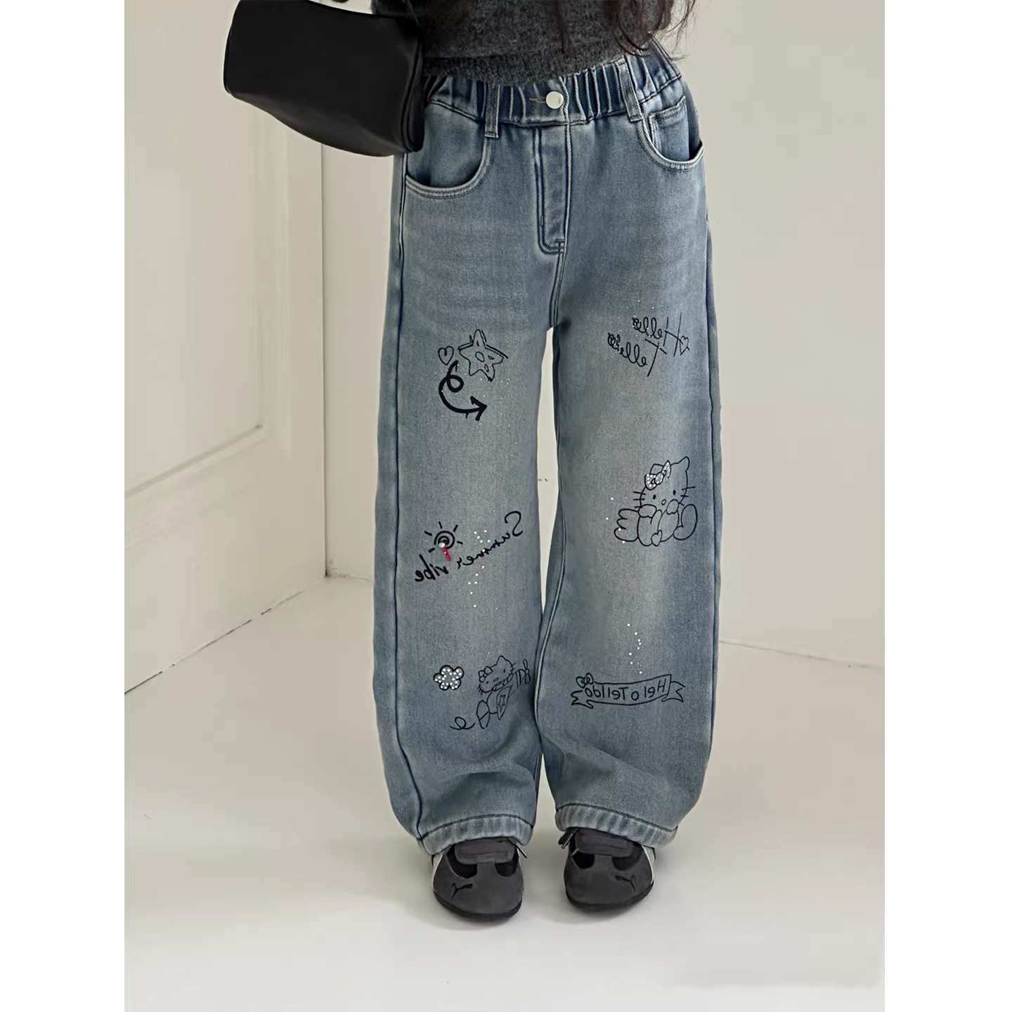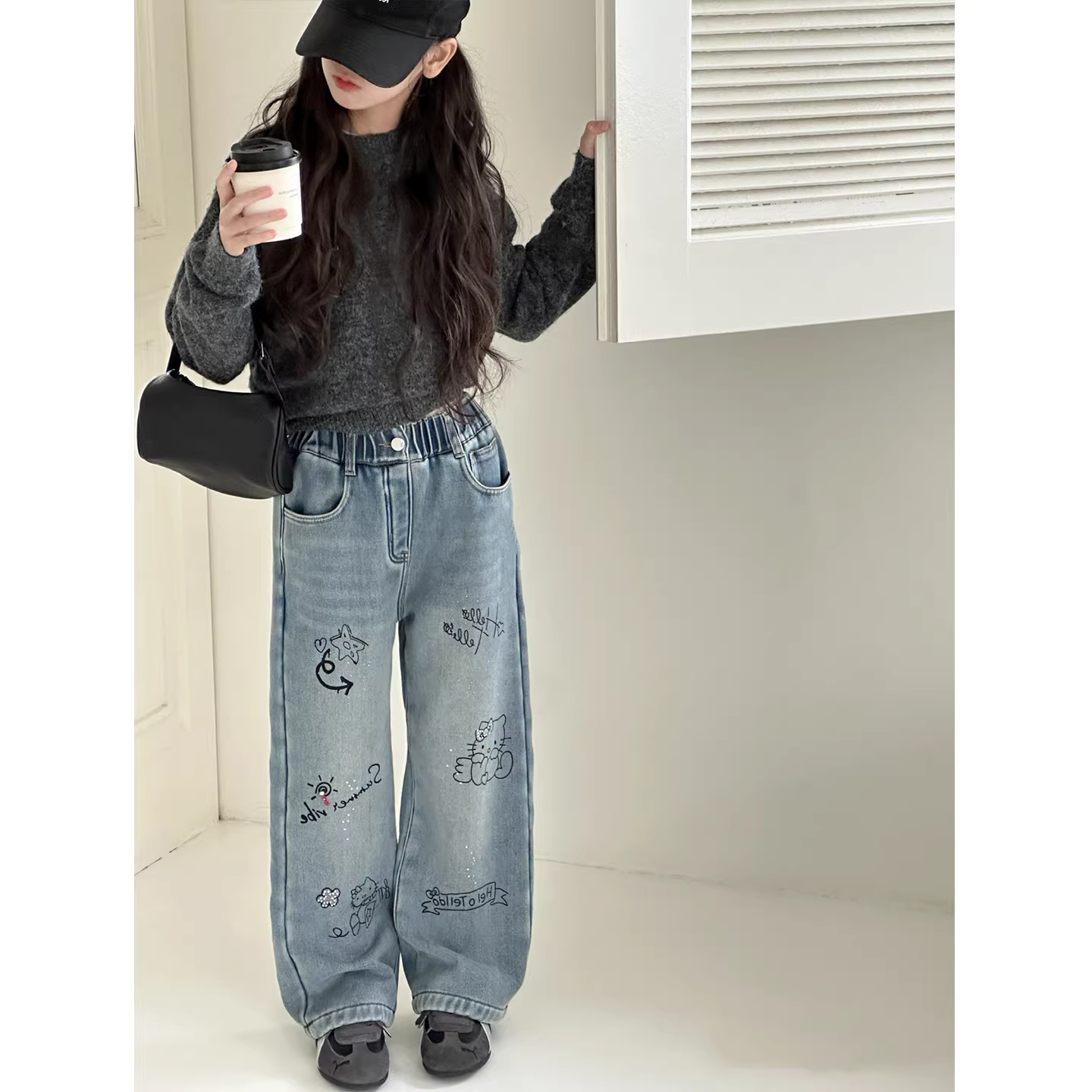 Quần jean ống thẳng lót lông cừu dành cho bé gái, quần ống rộng dày dặn dành cho trẻ lớn, quần rộng rãi, phong cách giản dị, đa năng mùa thu đông