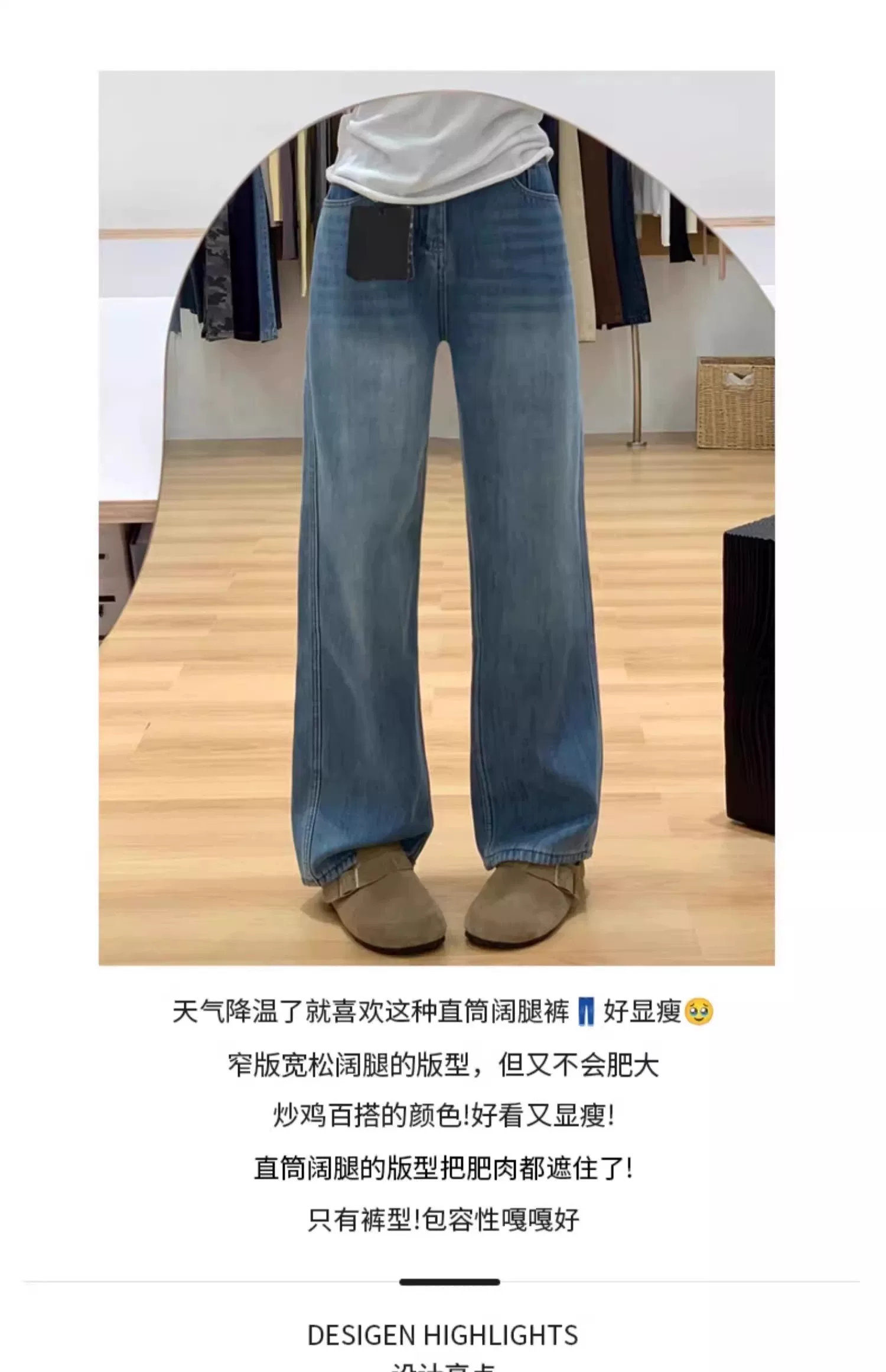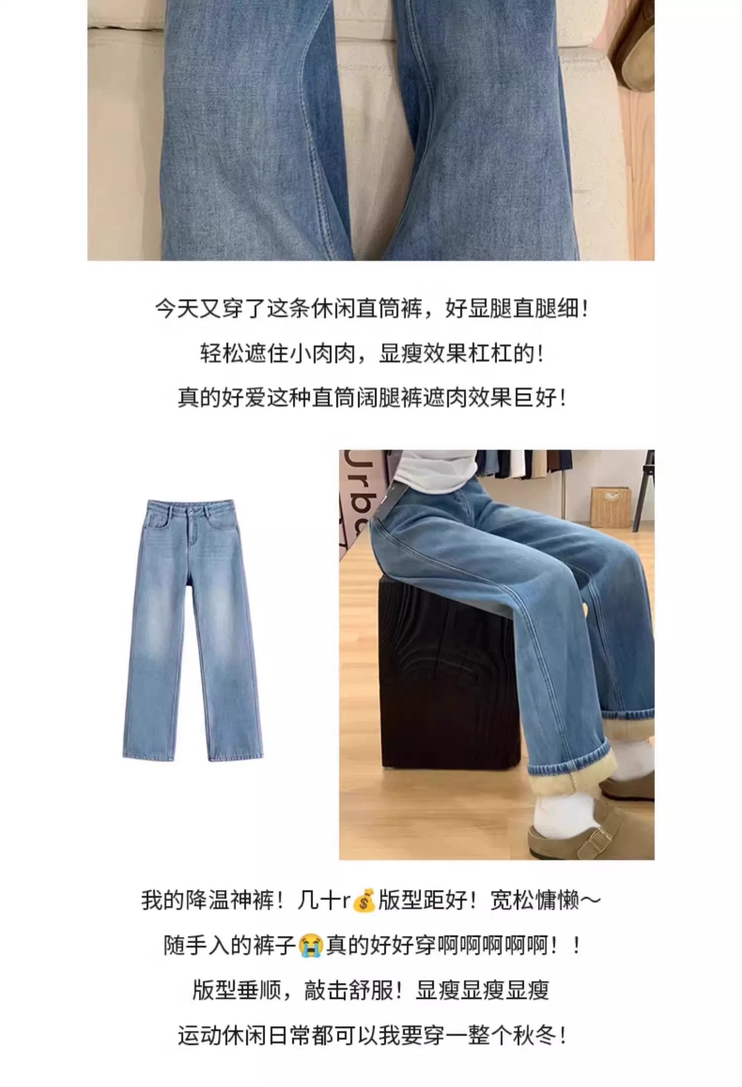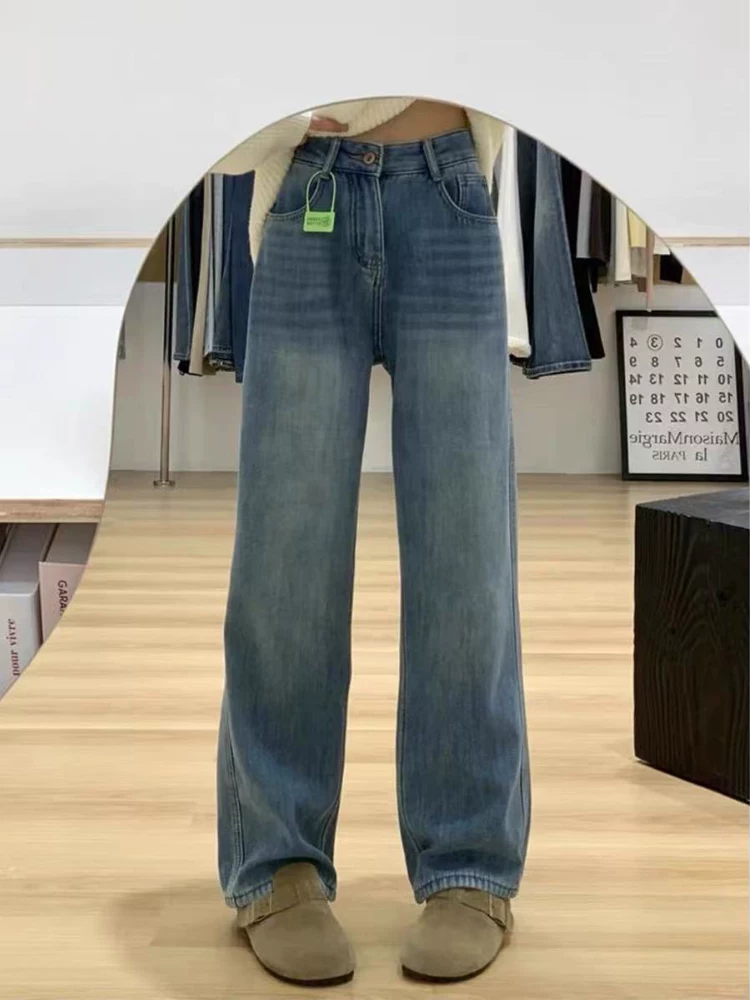 - Quần jean ống thẳng màu sáng cho nữ, mùa thu đông, lót lông cừu, cỡ lớn, lưng cao, che hông, giảm béo, dáng quả lê, quần ống rộng
