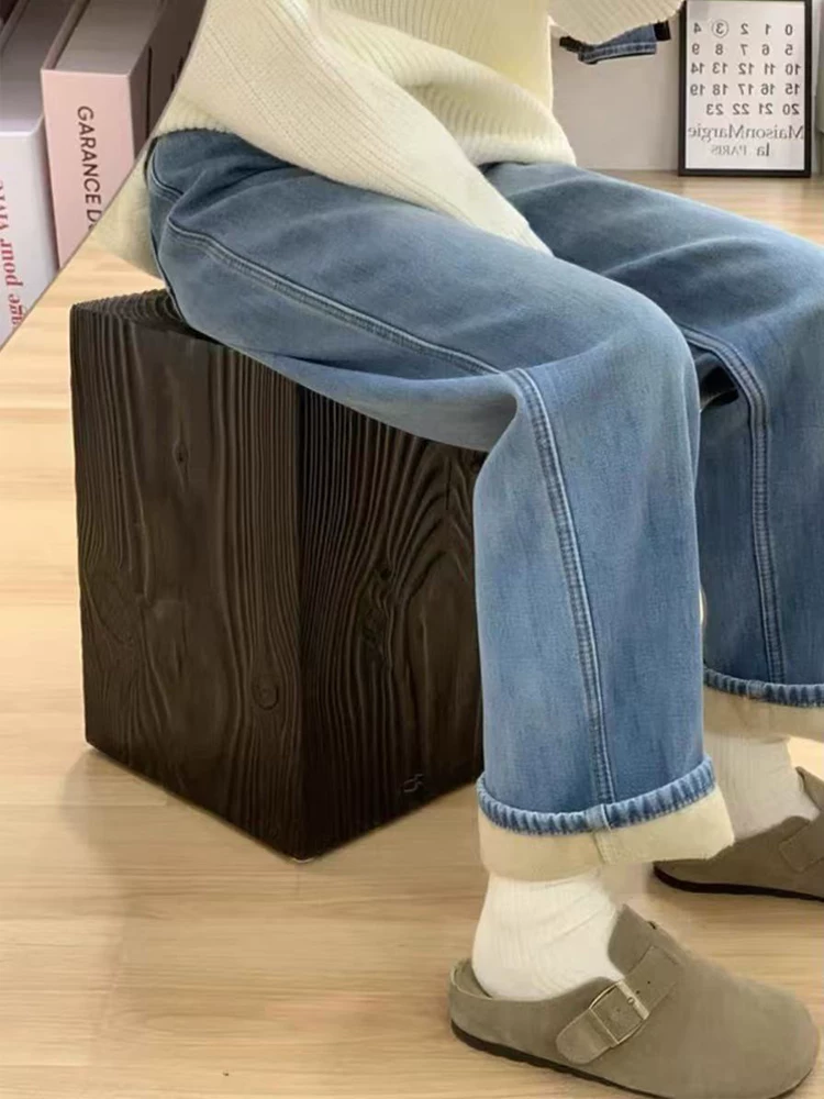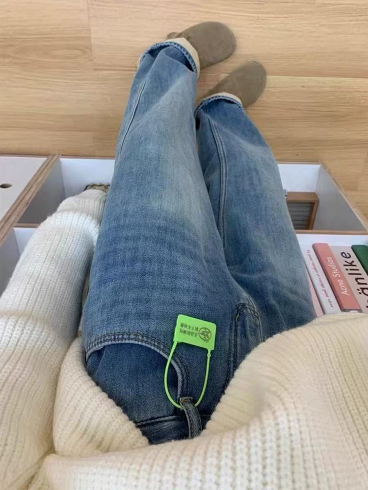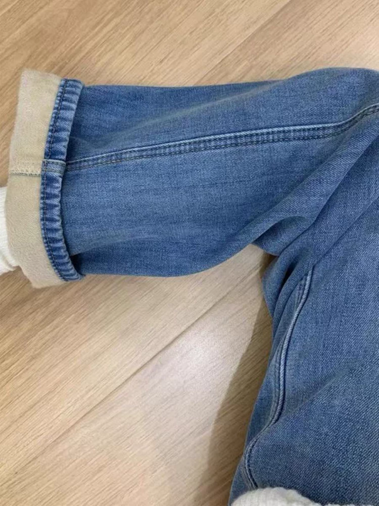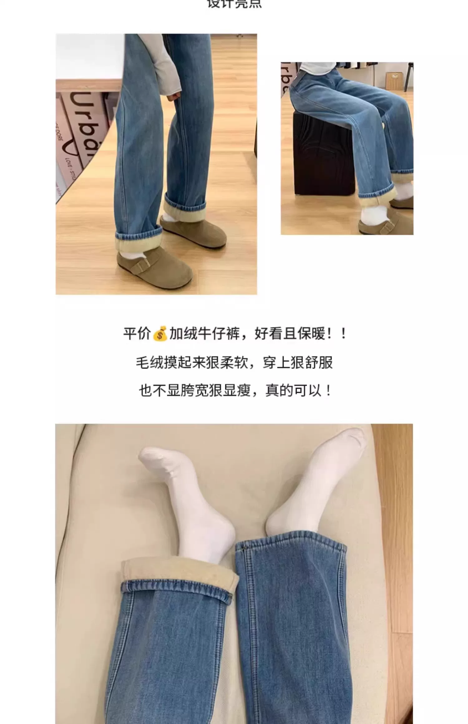 - Quần jean ống thẳng màu sáng cho nữ, mùa thu đông, lót lông cừu, cỡ lớn, lưng cao, che hông, giảm béo, dáng quả lê, quần ống rộng