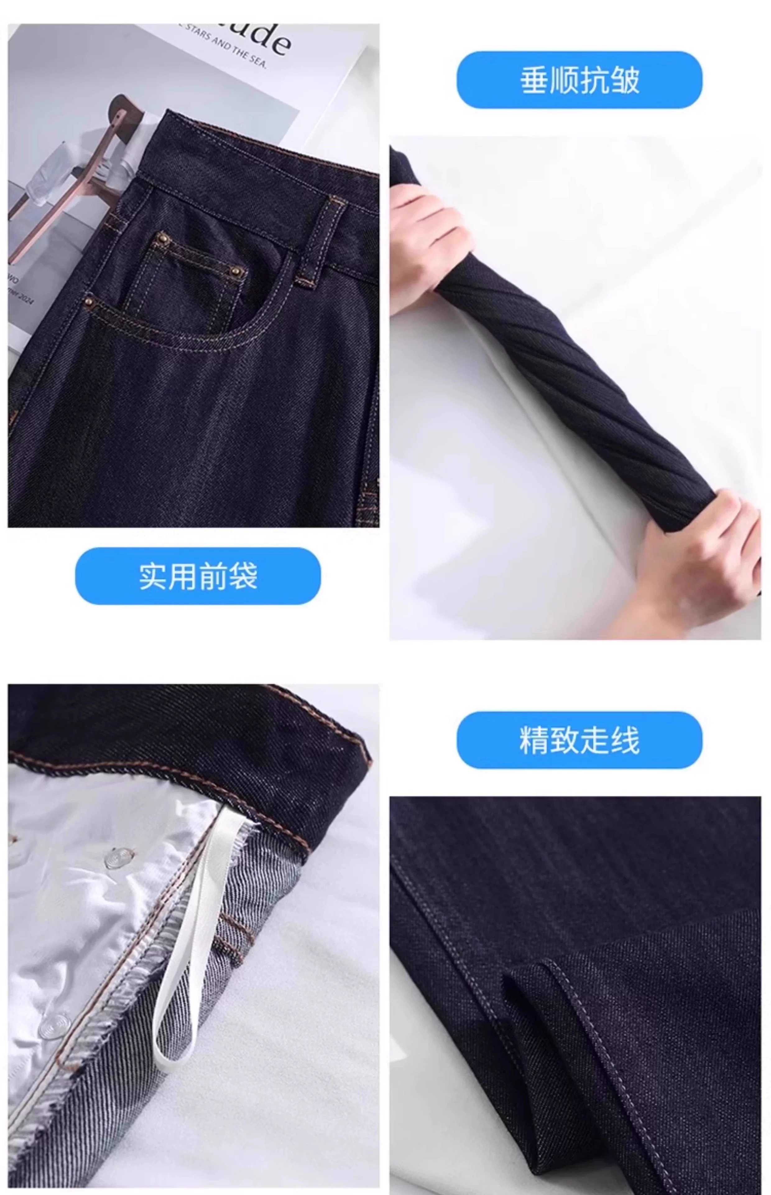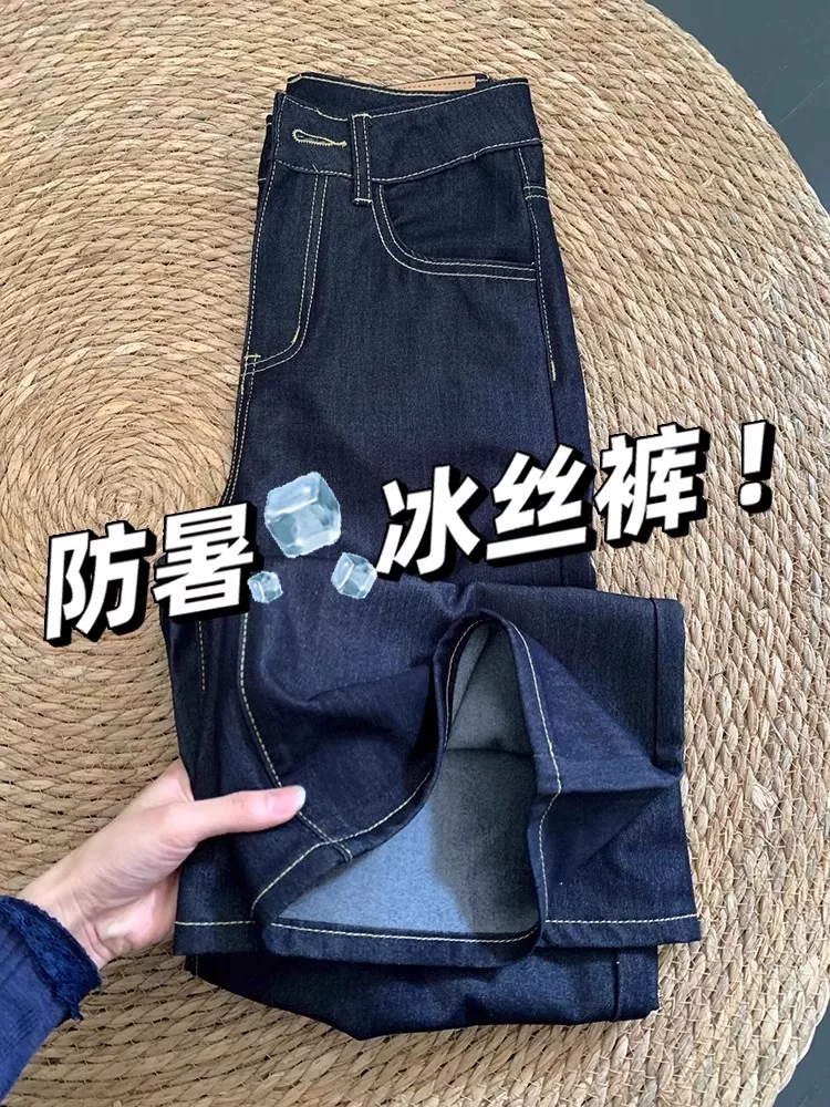 - Quần jean ống thẳng màu xanh denim dành cho nữ, kiểu dáng mỏng mùa hè, cỡ lớn, lưng cao, tôn dáng, quần ống rộng bằng vải lụa băng mềm mại.