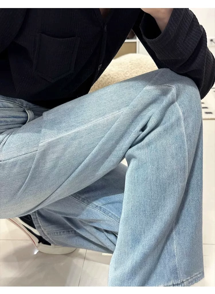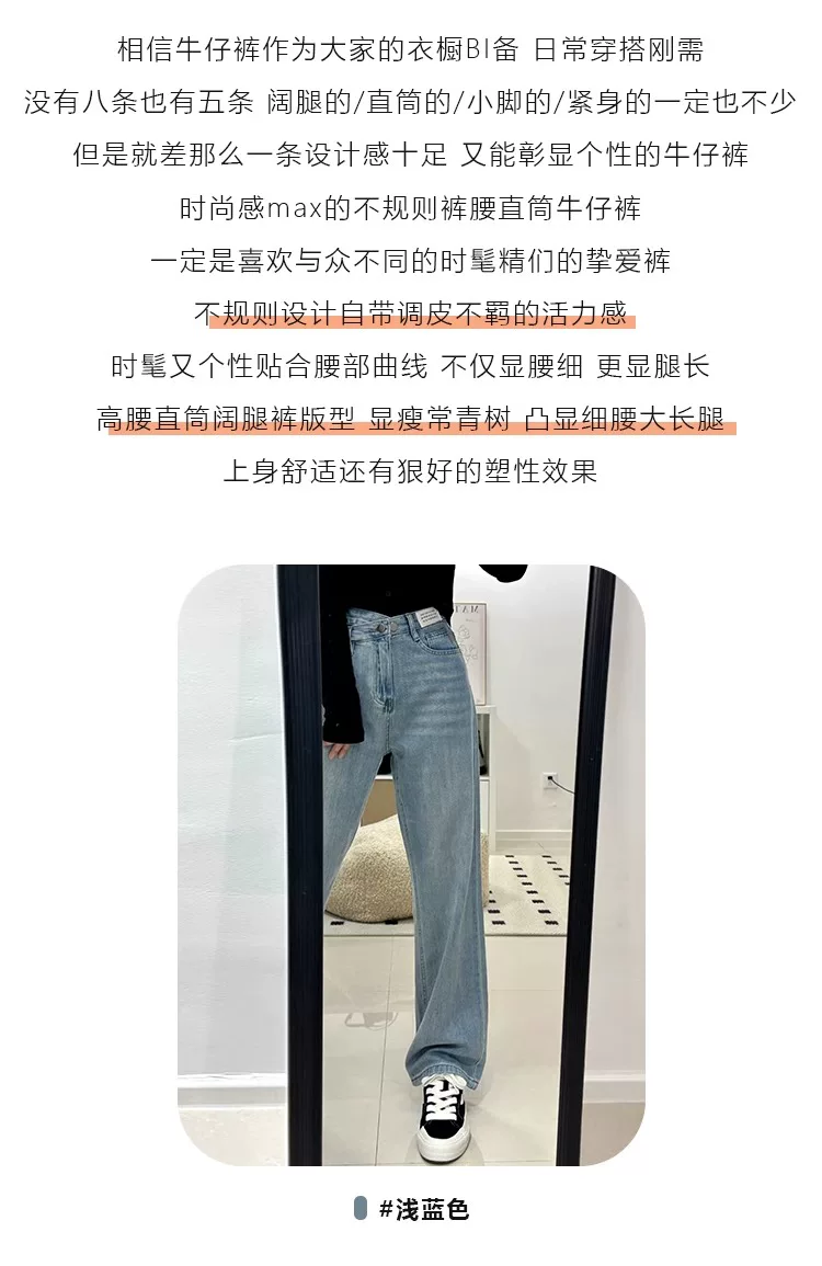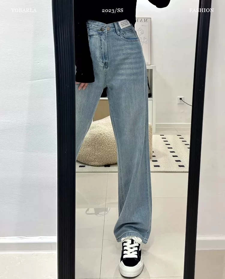 Quần jean ống thẳng màu xanh nhạt dành cho nữ có thân hình hình quả lê, đầu thu, cỡ lớn, cạp cao, quần ống rộng thon gọn