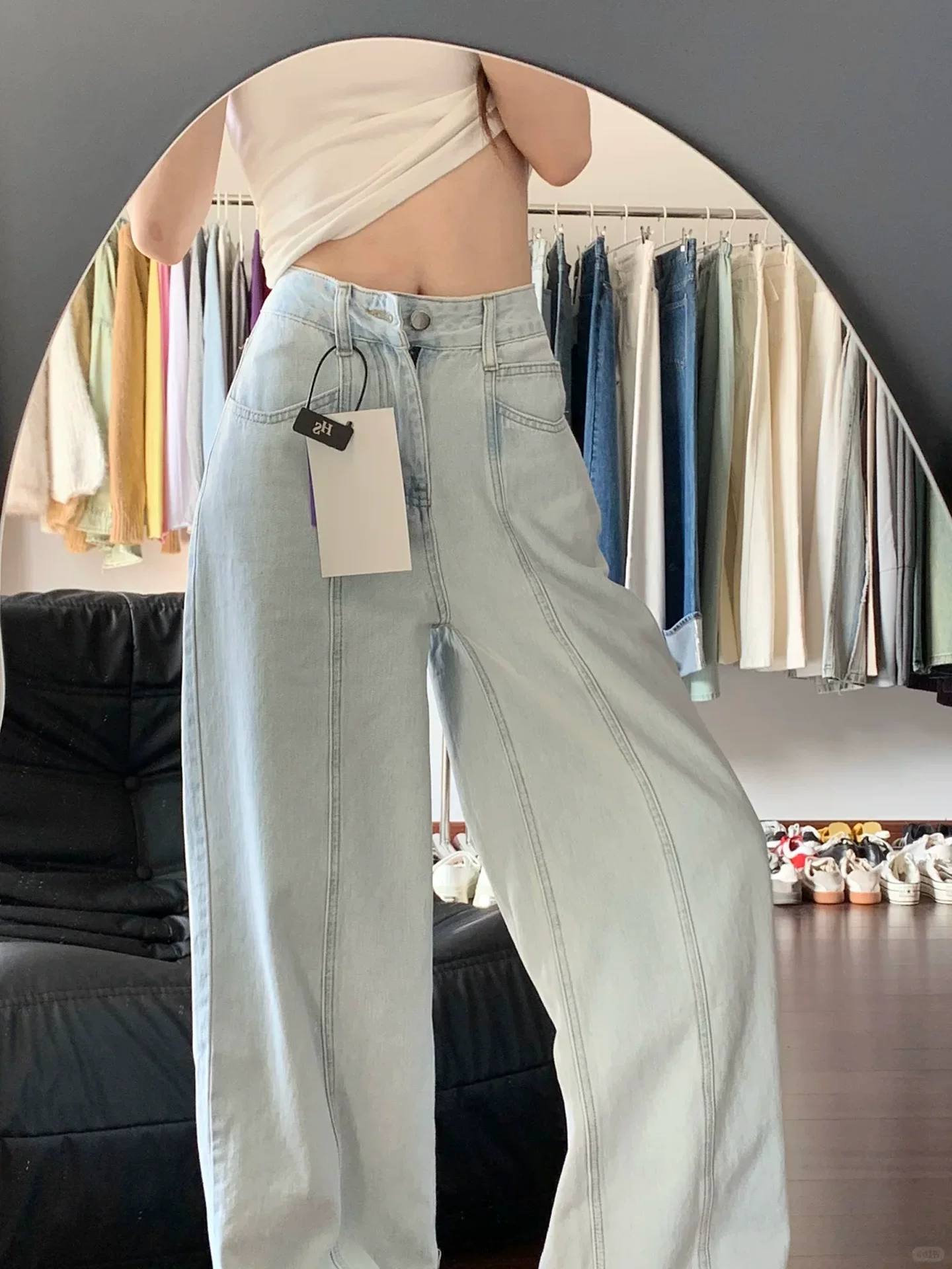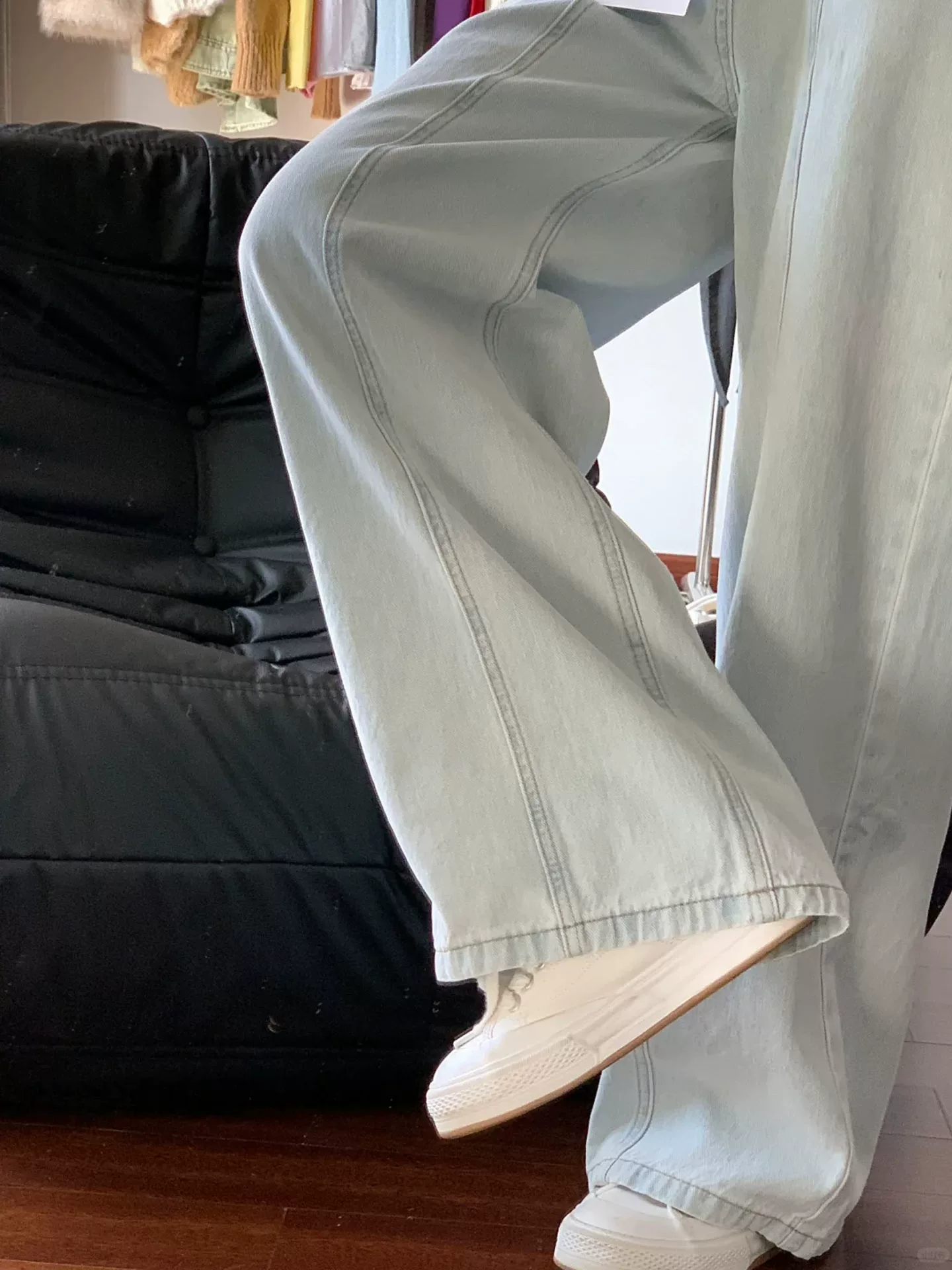 Quần jean ống thẳng màu xanh nhạt kiểu Mỹ dành cho nữ, bộ sưu tập mùa thu mới, cỡ lớn, lưng cao, dáng rộng, dáng suông, dáng rộng, quần dài đến sàn.