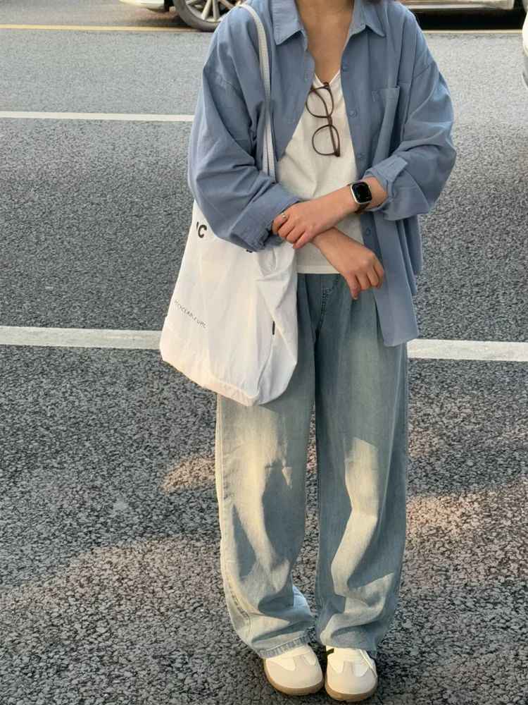- Quần jean ống thẳng Tencel màu xanh nhạt dành cho nữ, kiểu dáng mỏng mùa hè, cỡ lớn, lưng cao, dáng rộng, suôn mềm, quần ống rộng giúp thon gọn.