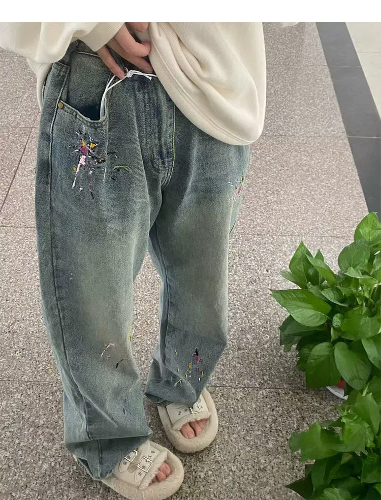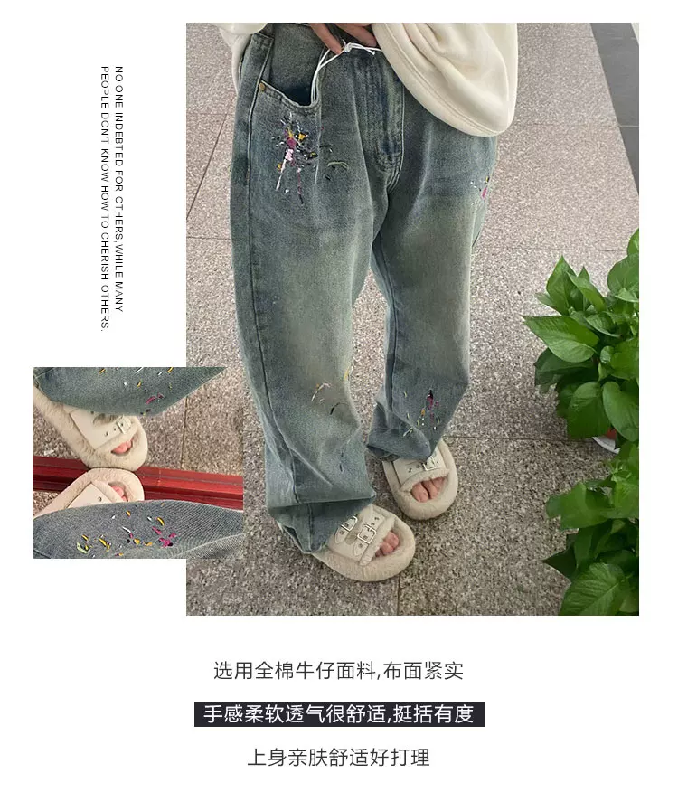 Quần jean ống thẳng thêu hình quả lê dành cho nữ, cỡ lớn, mặc đầu thu, lưng cao, dáng rộng, che hông, quần ống rộng giảm béo