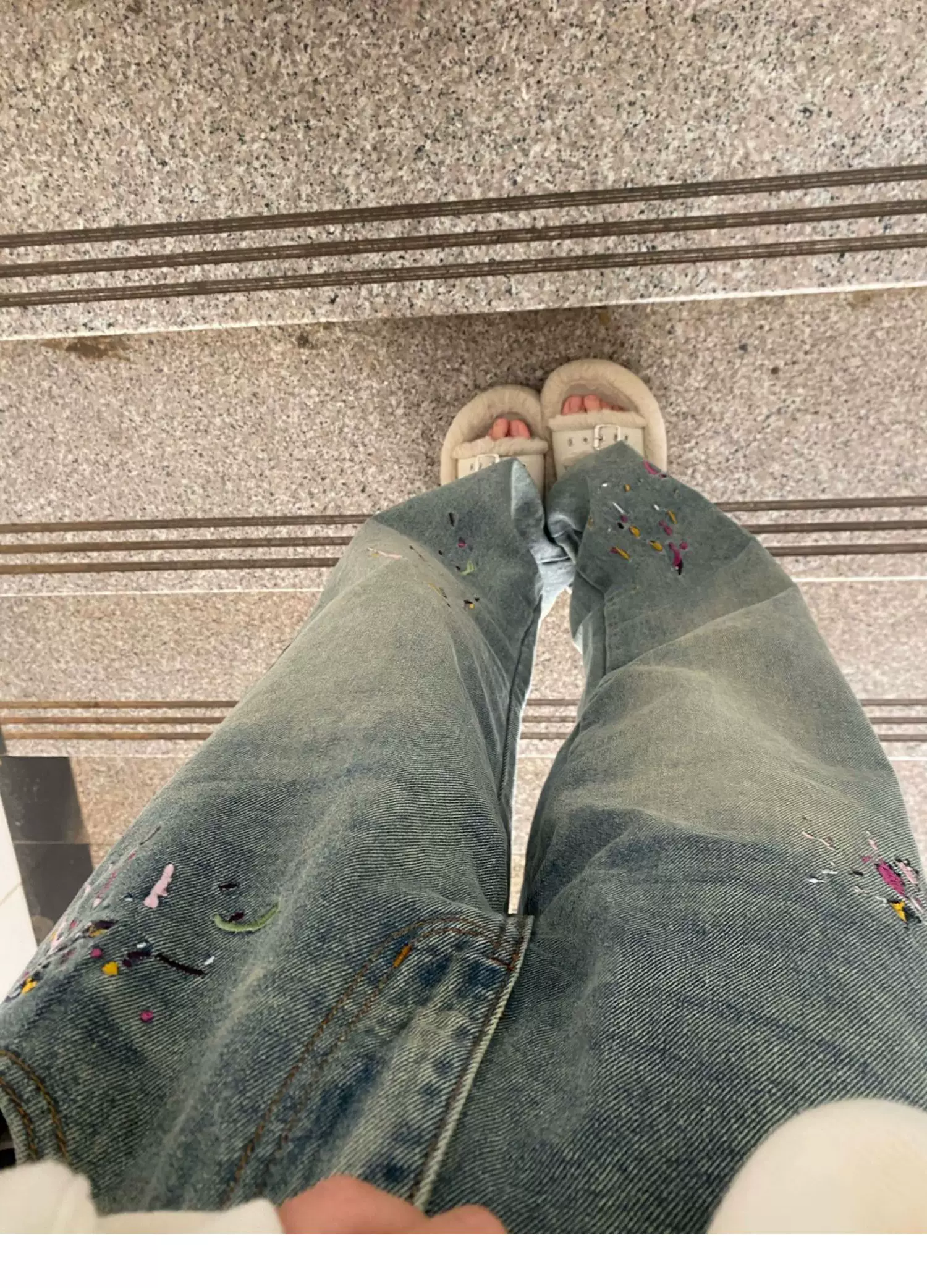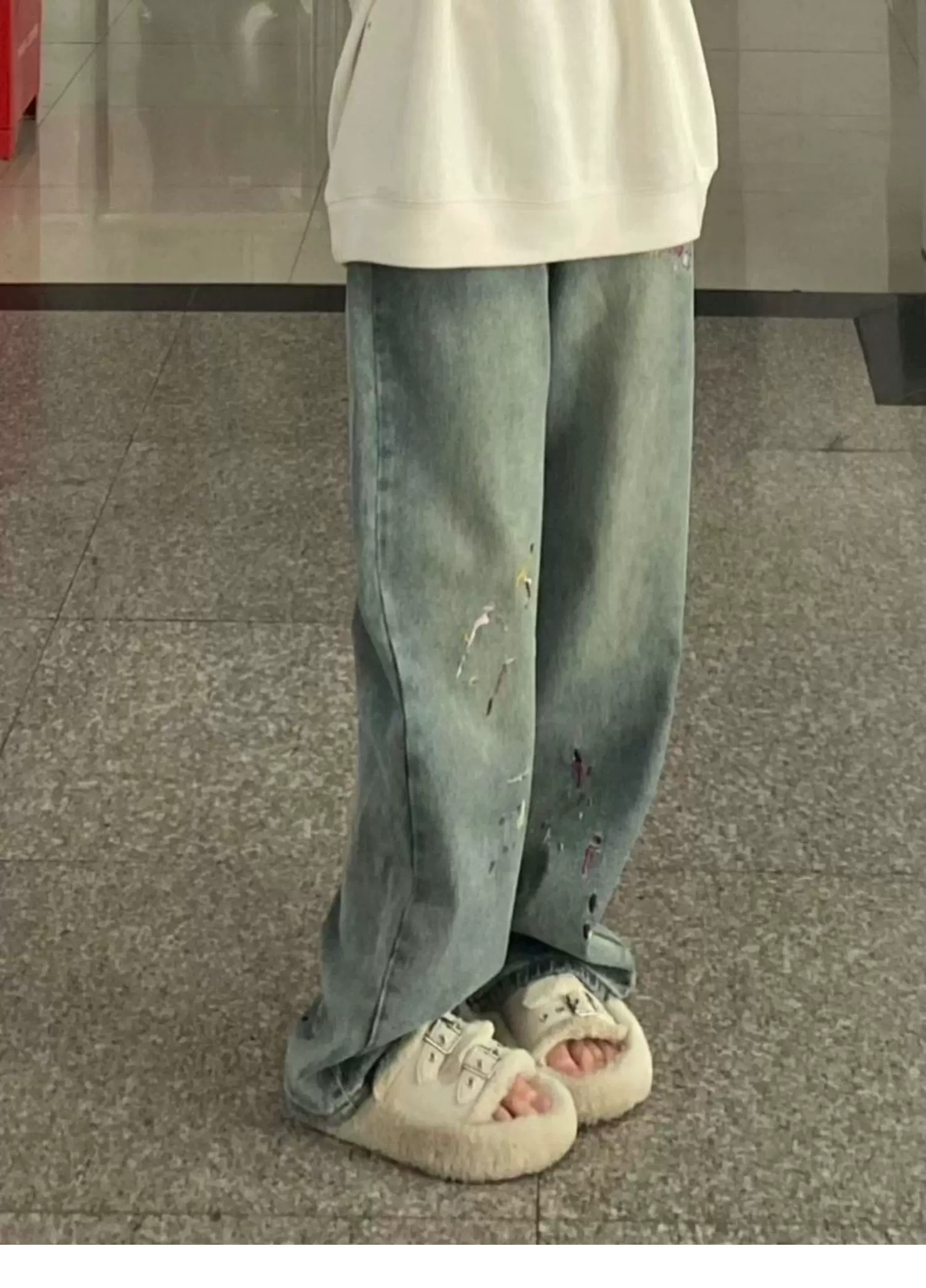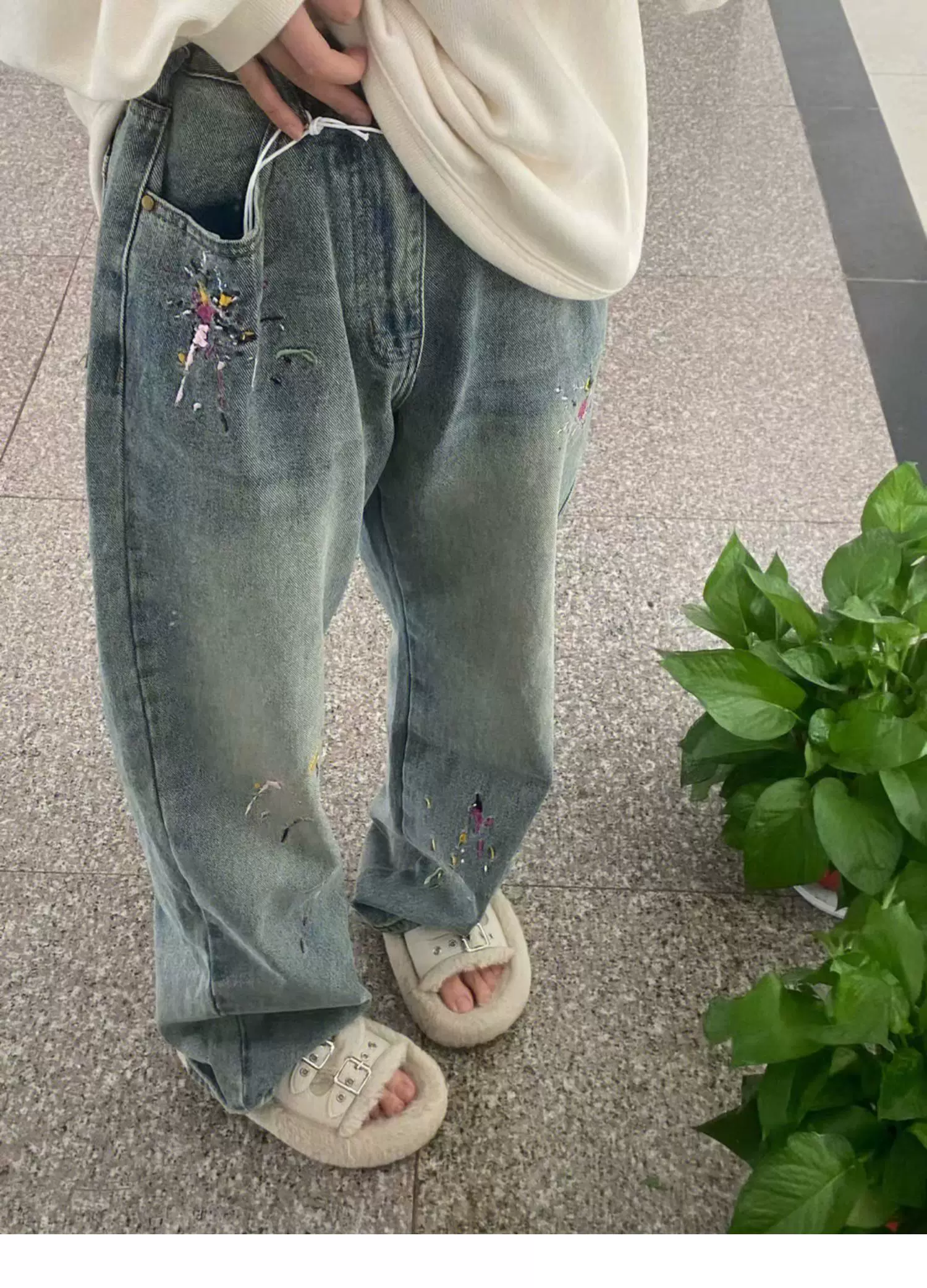 - Quần jean ống thẳng thêu hình quả lê dành cho nữ, cỡ lớn, mặc đầu thu, lưng cao, dáng rộng, che hông, quần ống rộng giảm béo