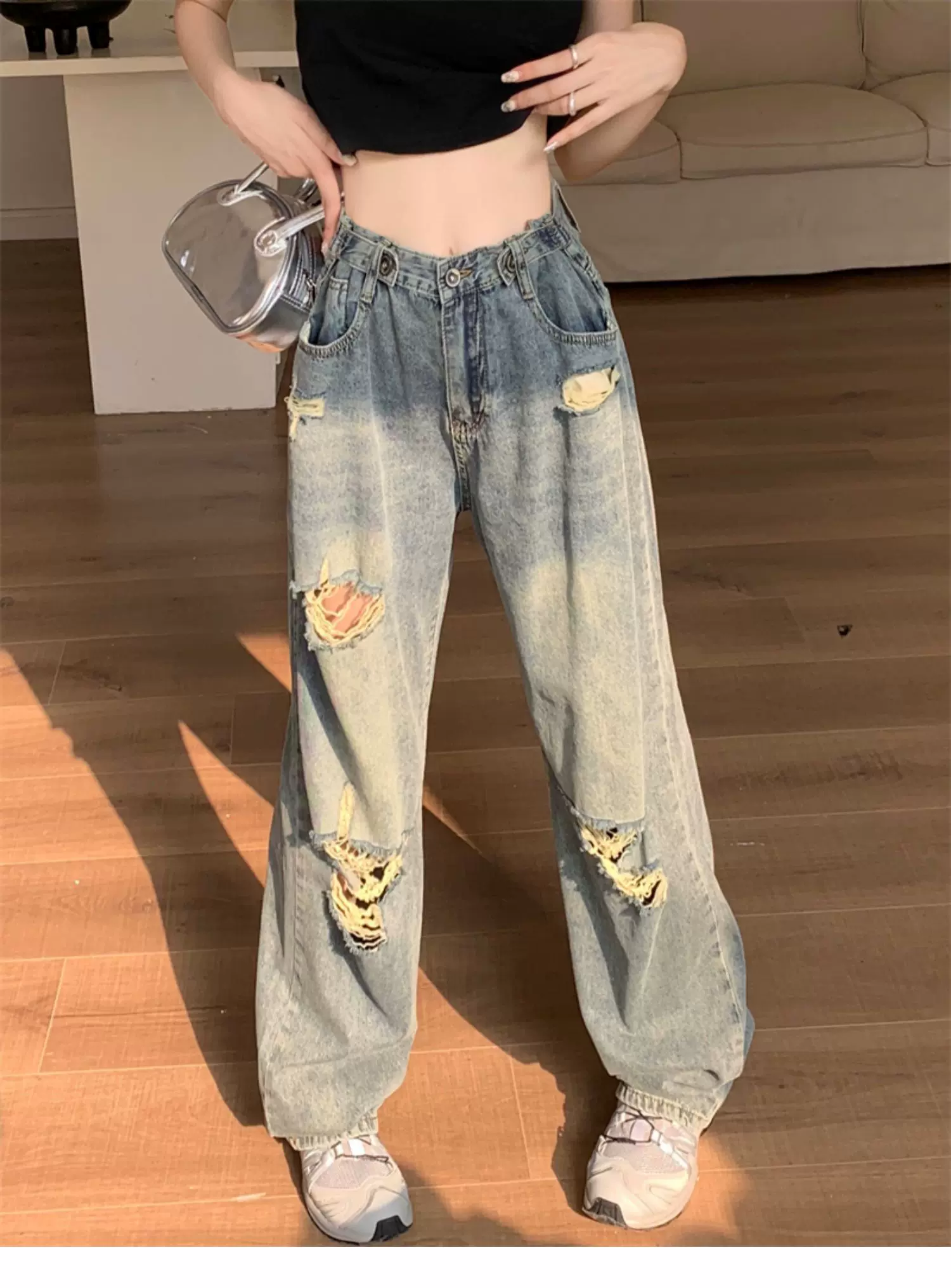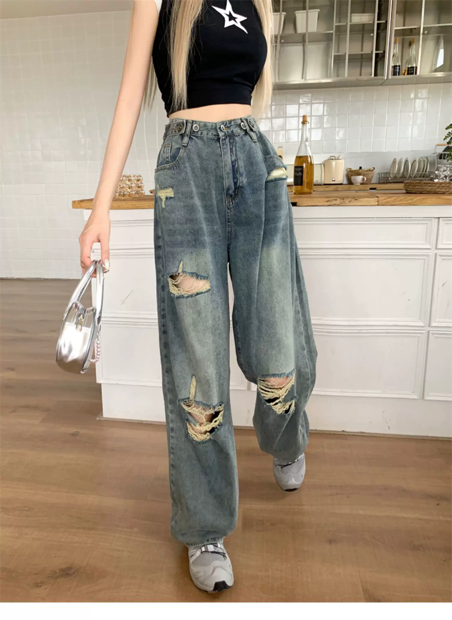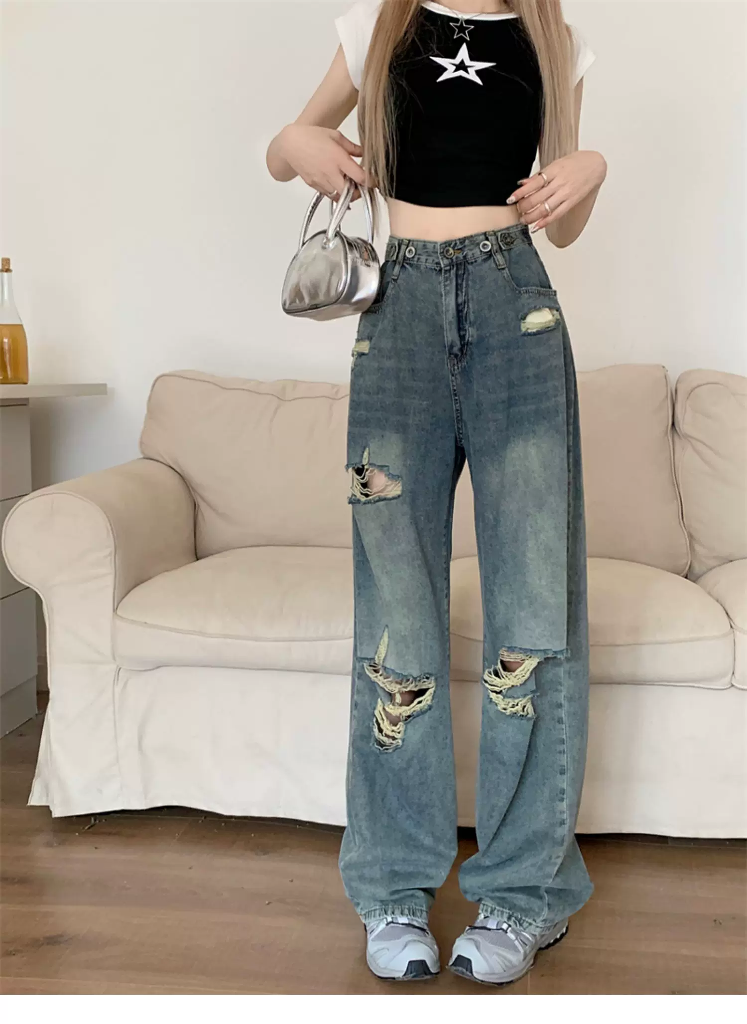 - Quần jean rách dáng lê dành cho nữ, size lớn mùa hè, thiết kế lưng cao, dáng rộng thẳng, quần ống rộng tôn dáng
