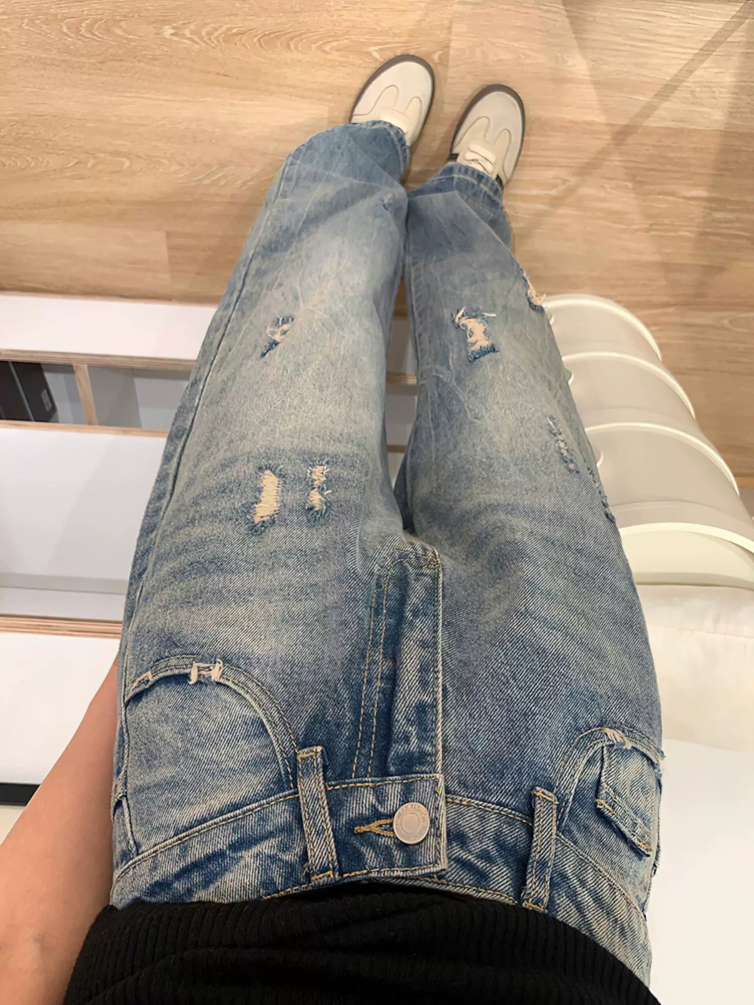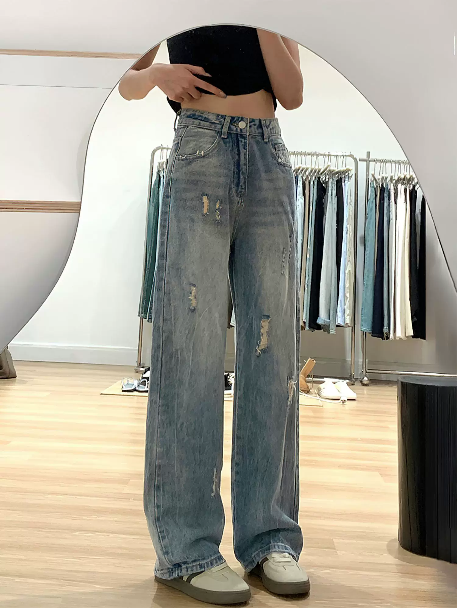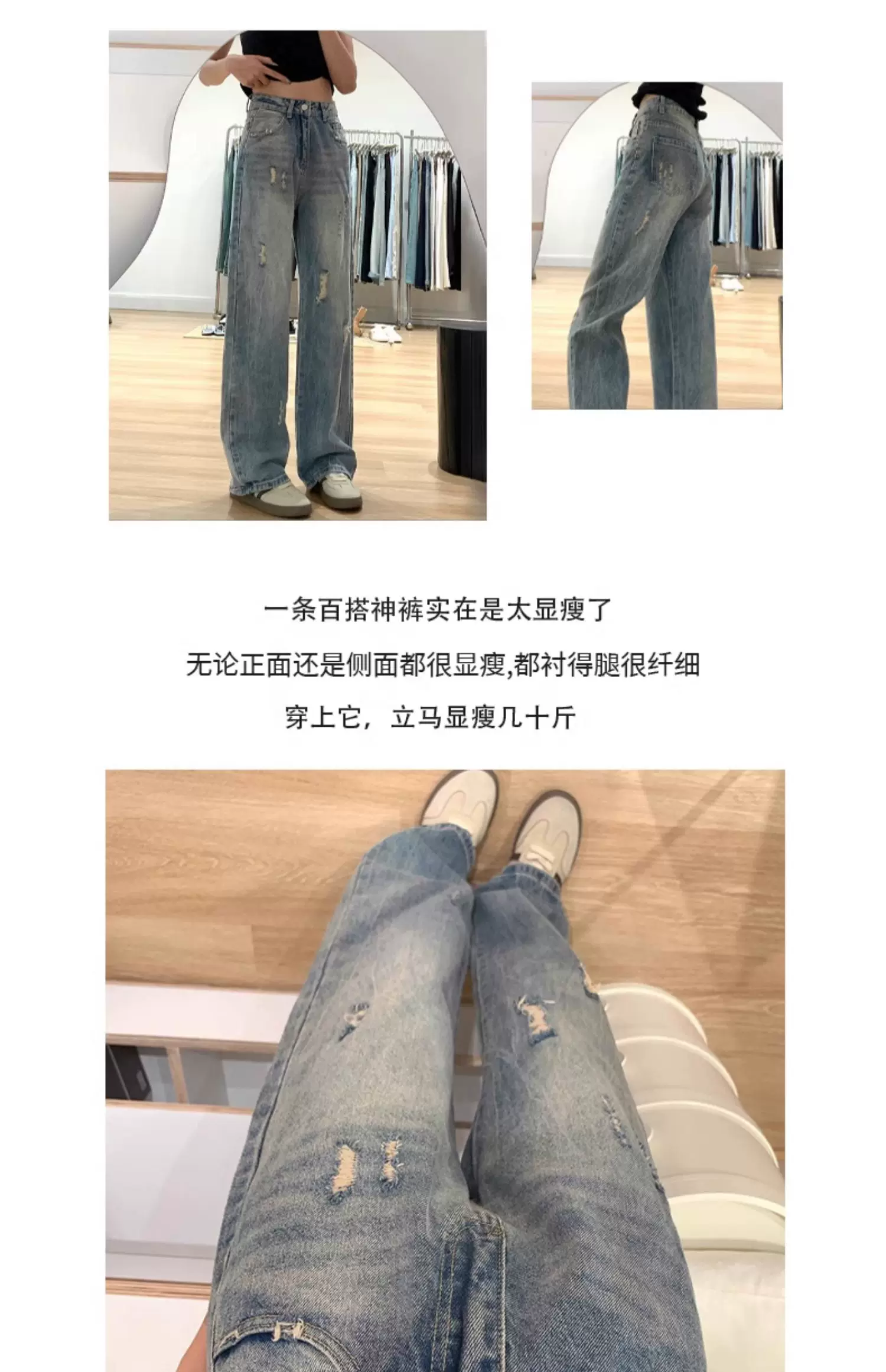 - Quần jean rách màu xanh cổ điển dành cho nữ, phong cách mùa thu mới, cỡ lớn, lưng cao, dáng rộng, thon gọn, dáng quả lê, quần ống rộng