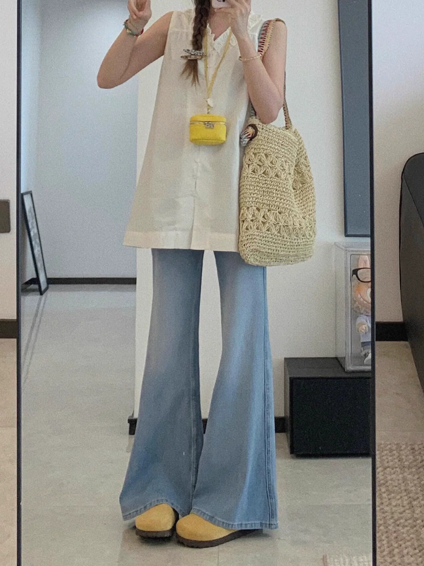 Quần jean Tencel màu sáng dành cho nữ, kiểu dáng mỏng mùa hè, cỡ lớn, lưng cao, tôn dáng, không bó sát, quần ống chuông bằng vải lụa băng