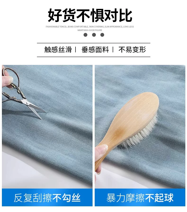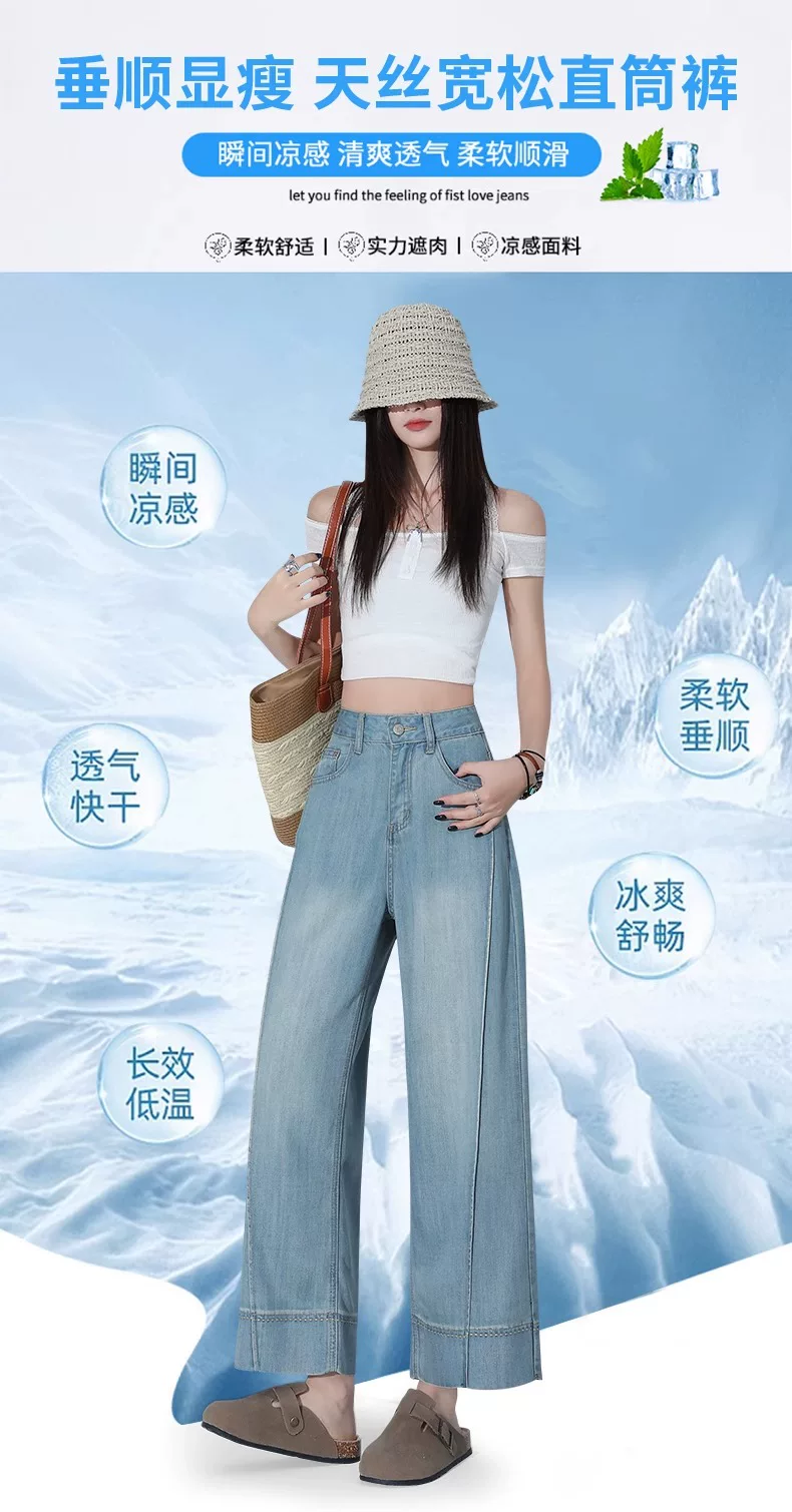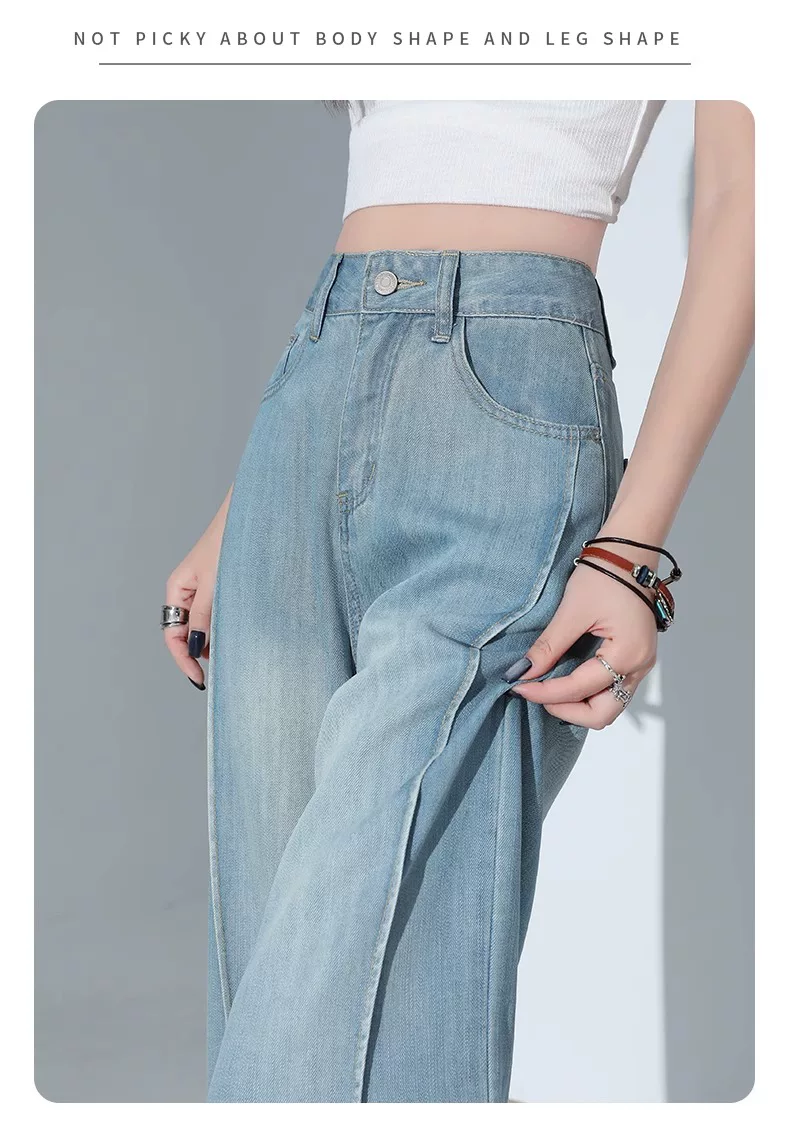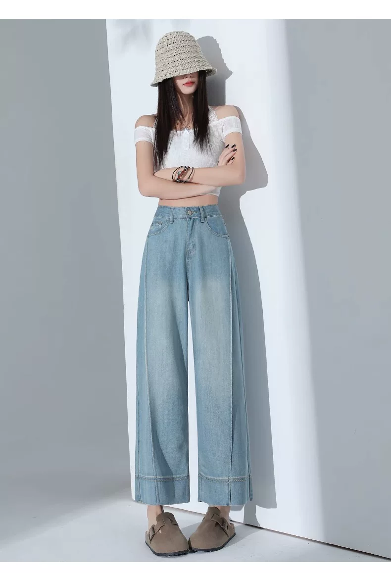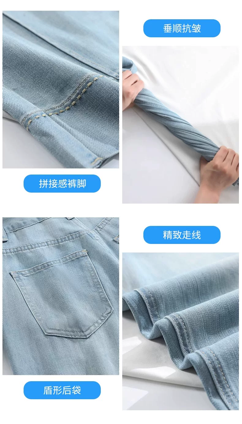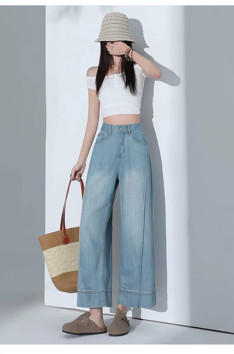 - Quần jean Tencel màu xanh nhạt dành cho nữ, kiểu dáng mỏng mùa hè, cỡ lớn, lưng cao, giảm béo, nhỏ nhắn, quần ống rộng bằng lụa băng.