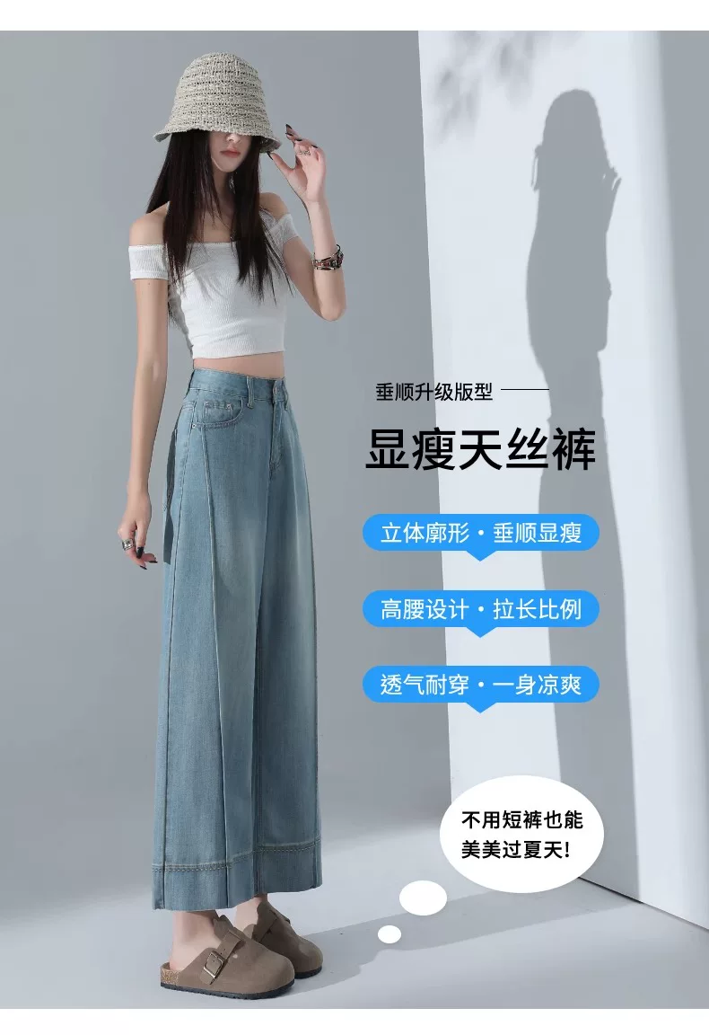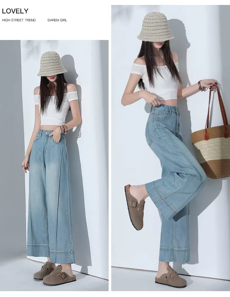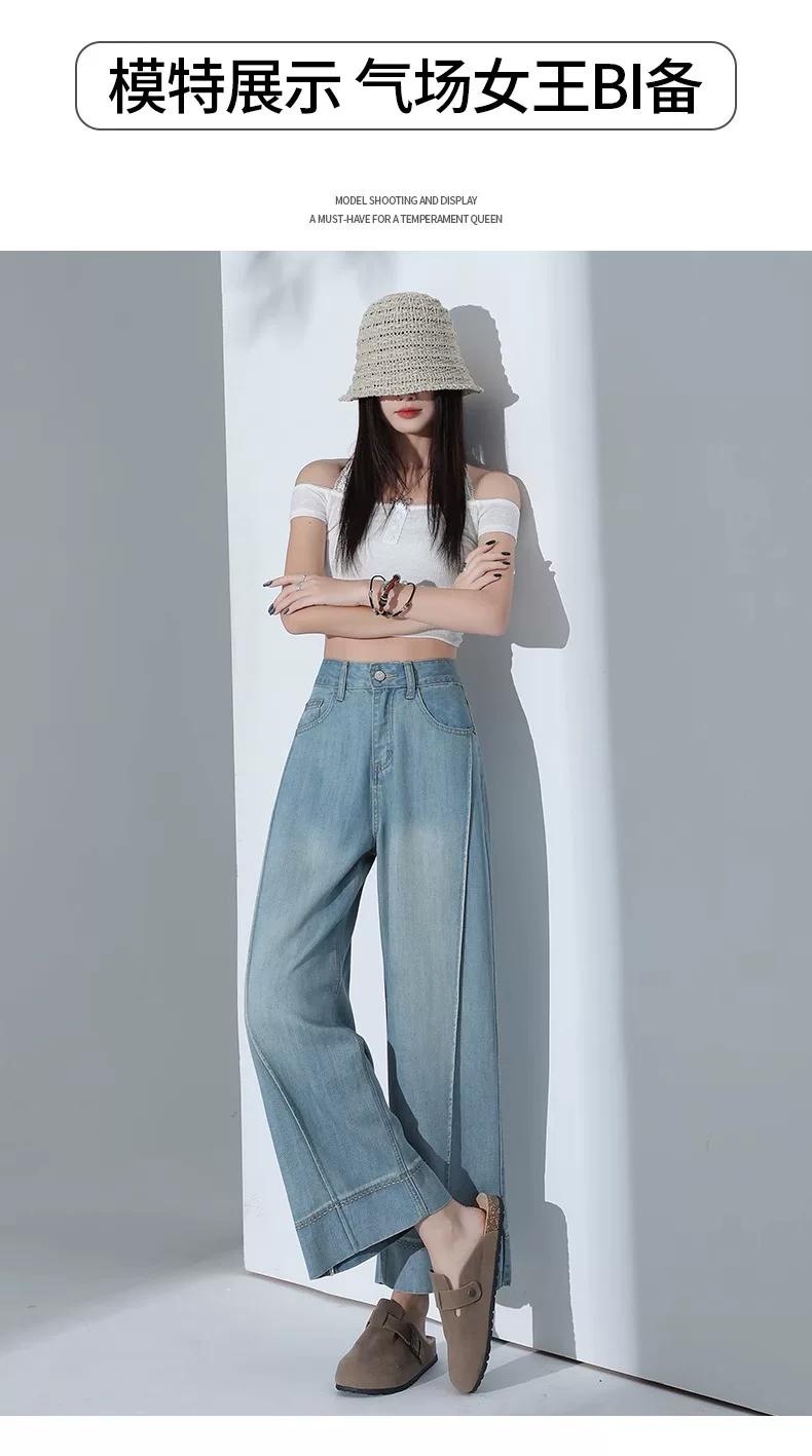 Quần jean Tencel màu xanh nhạt dành cho nữ, kiểu dáng mỏng mùa hè, cỡ lớn, lưng cao, giảm béo, nhỏ nhắn, quần ống rộng bằng lụa băng.