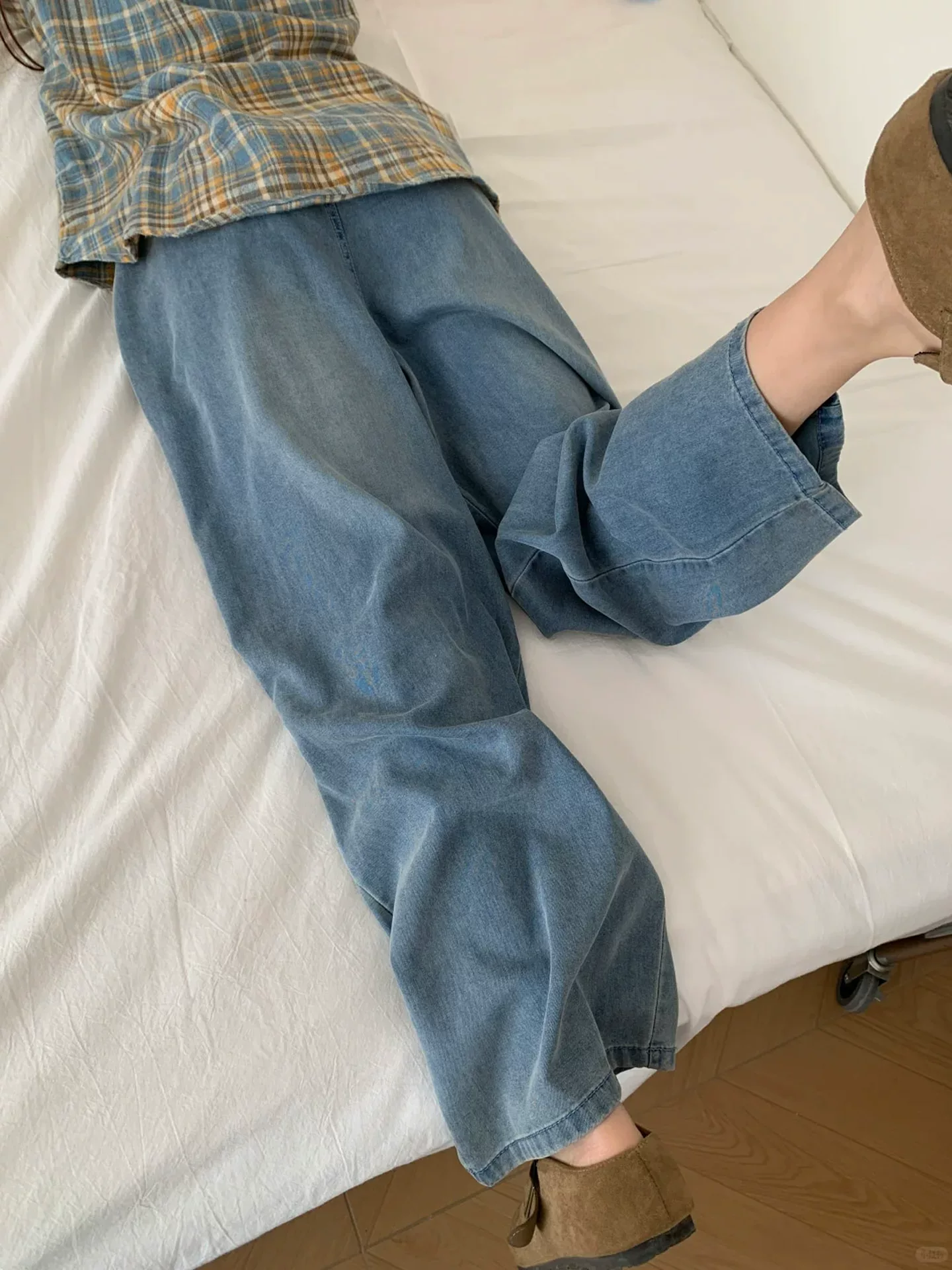 - Quần jean thẳng Tencel nữ, hè 2025, kiểu dáng mỏng, size lớn, dáng nhỏ nhắn, cạp cao, tôn dáng, chất liệu lụa đá mềm mại