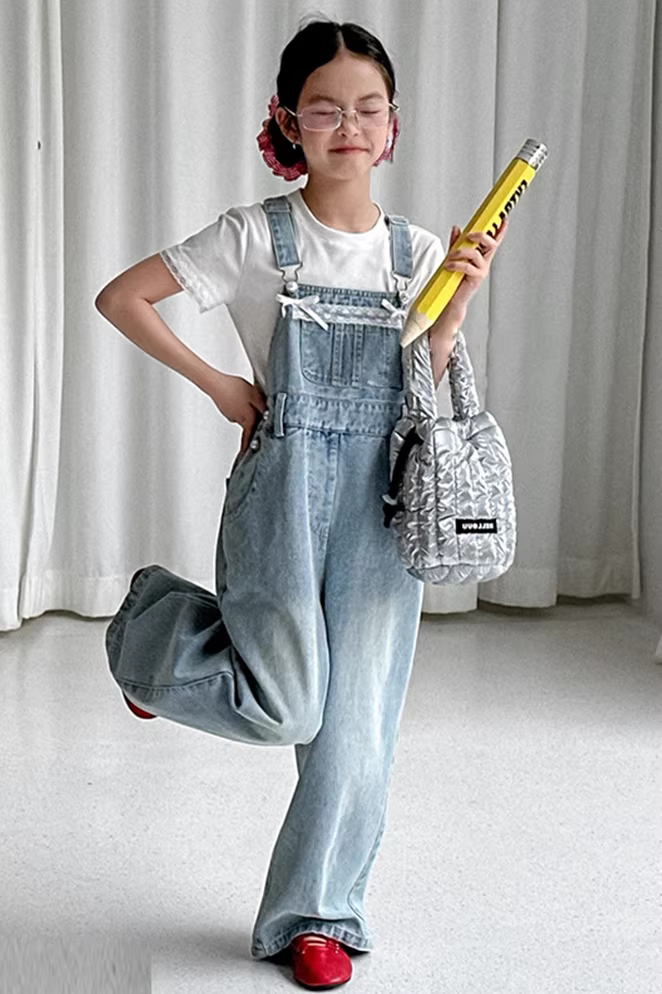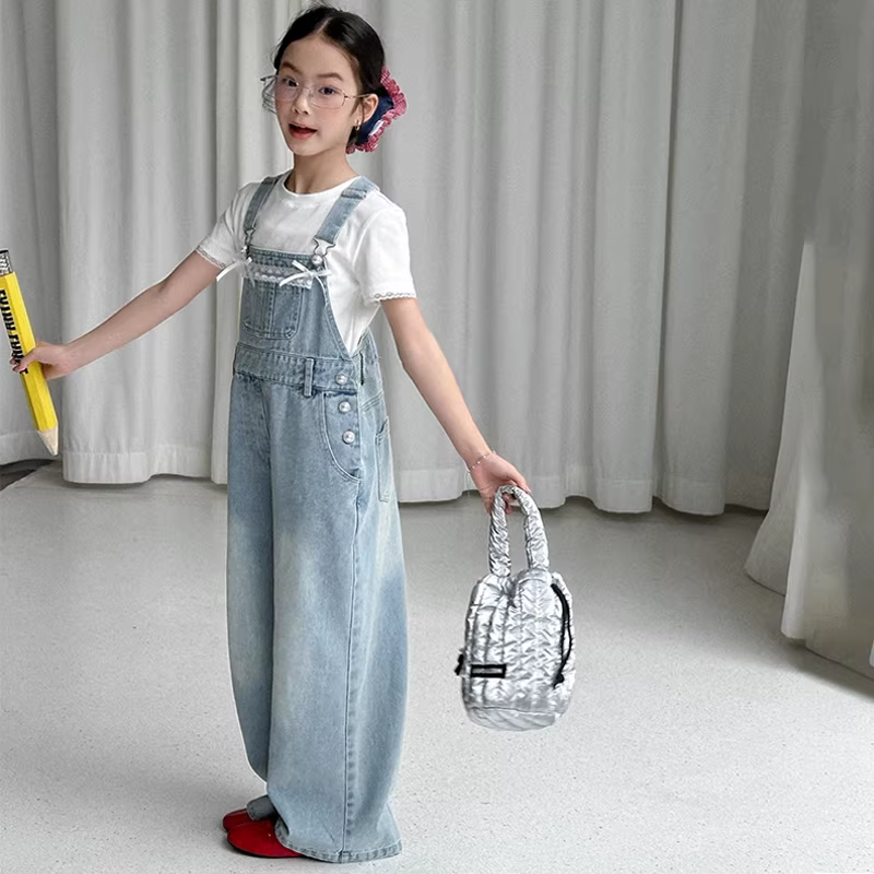Quần jean thắt nơ cho bé gái 25 kiểu dáng mới xuân thu quần ống đứng cho trẻ lớn có dây đeo có thể điều chỉnh