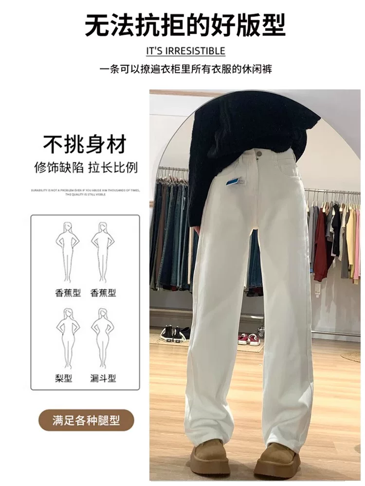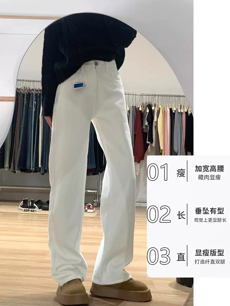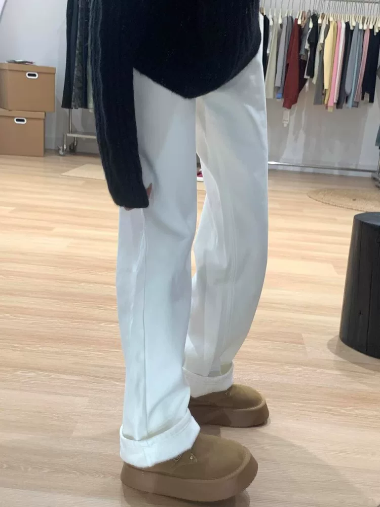 - Quần jean trắng dáng thẳng dành cho nữ, mùa thu đông, cỡ lớn, lưng cao, dáng rộng, dáng thon gọn, lót lông cừu, dày dặn, quần ống rộng.