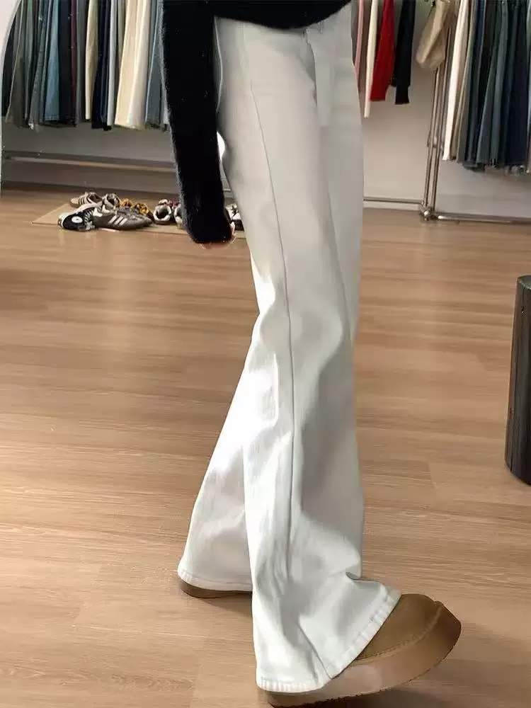 Quần jean trắng loe dành cho nữ, mùa đông, cỡ lớn, lót lông cừu, dày dặn, cạp cao, co giãn, che hông, tôn dáng, kiểu dáng bootcut.