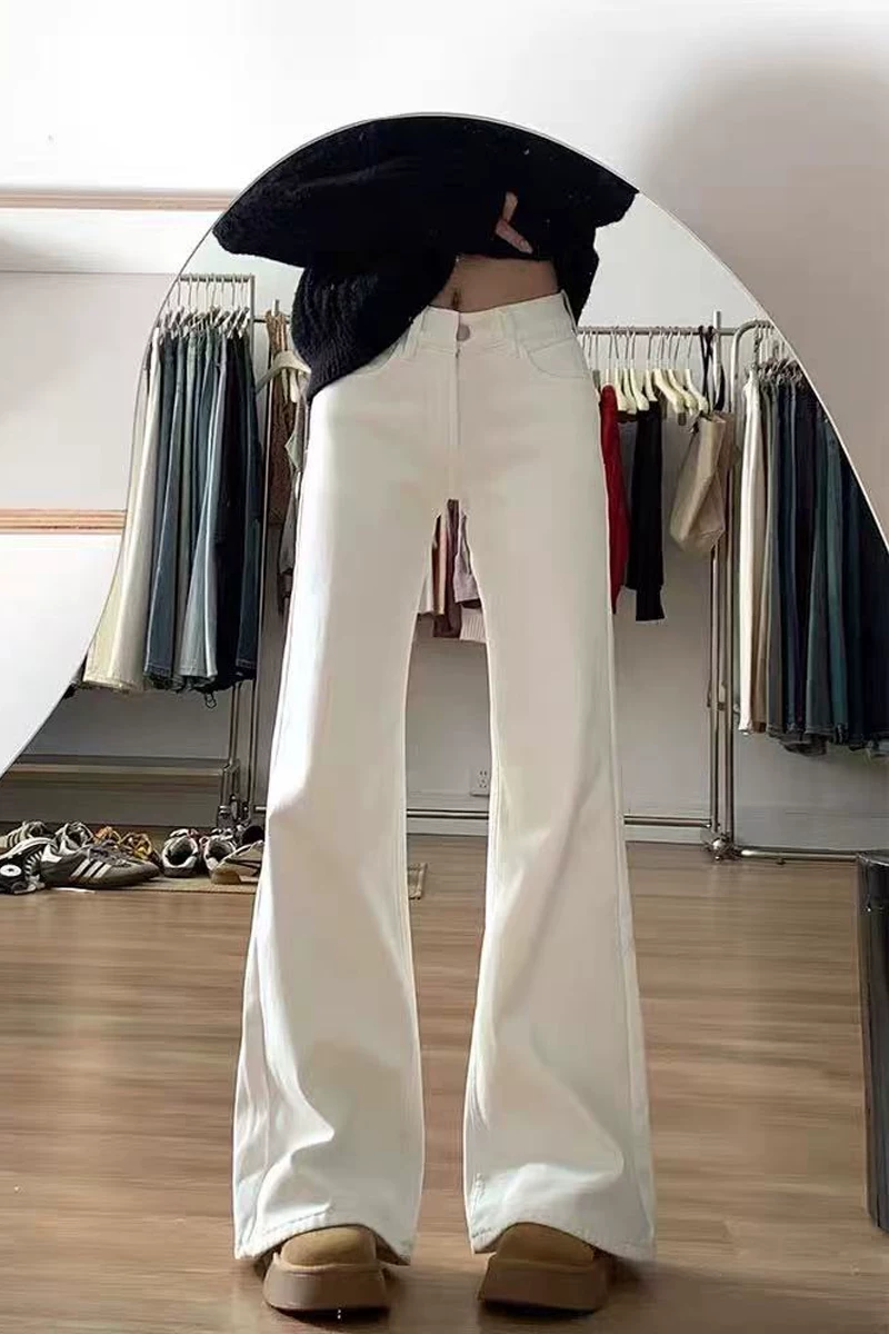 - Quần jean trắng loe dành cho nữ, mùa đông, cỡ lớn, lót lông cừu, dày dặn, cạp cao, co giãn, che hông, tôn dáng, kiểu dáng bootcut.