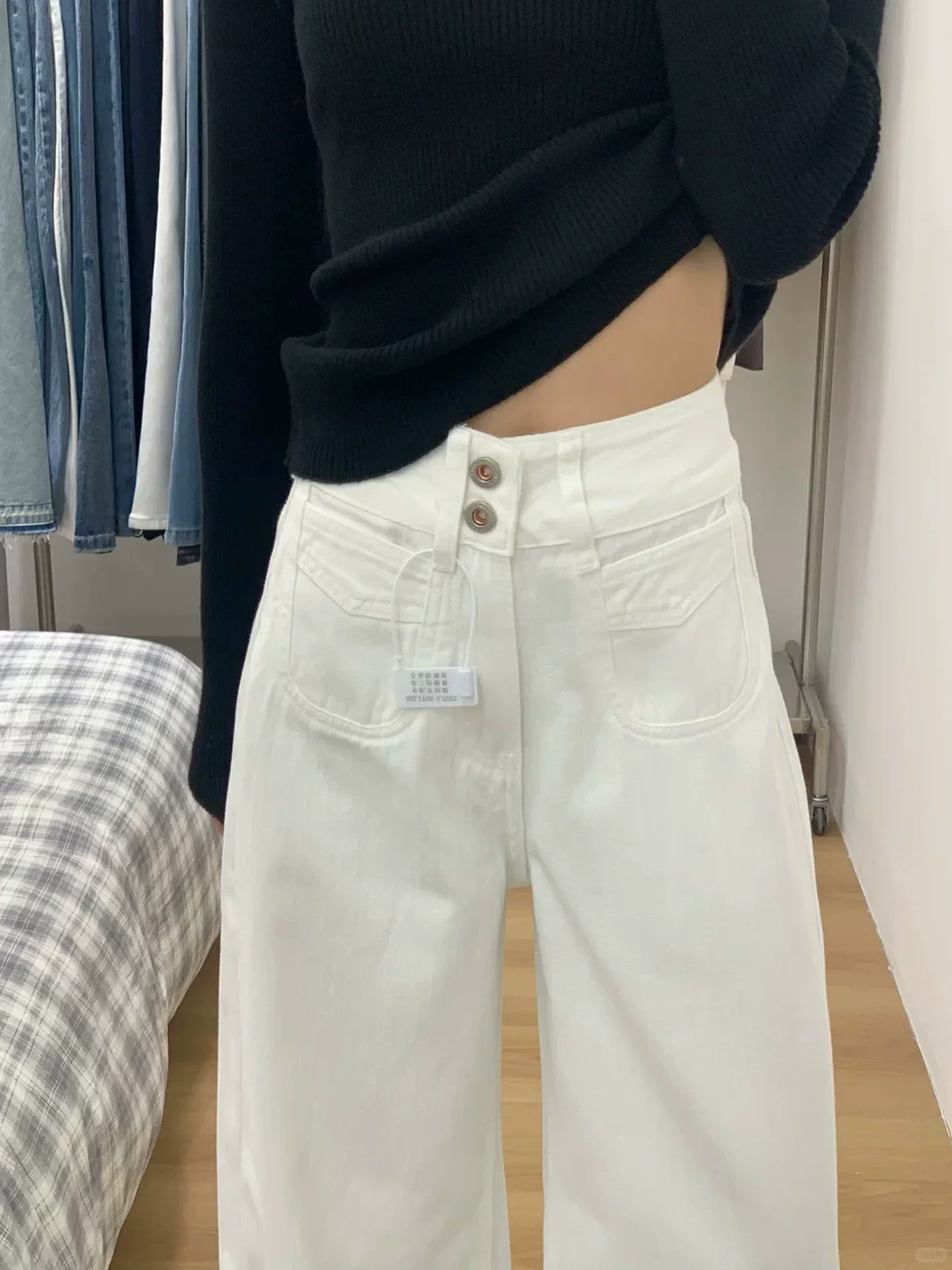 Quần jean trắng ống thẳng dành cho nữ, mặc đầu thu, cỡ lớn, lưng cao, dáng rộng, mềm mại, tôn dáng, quần ống rộng dáng chữ A dài chạm sàn.