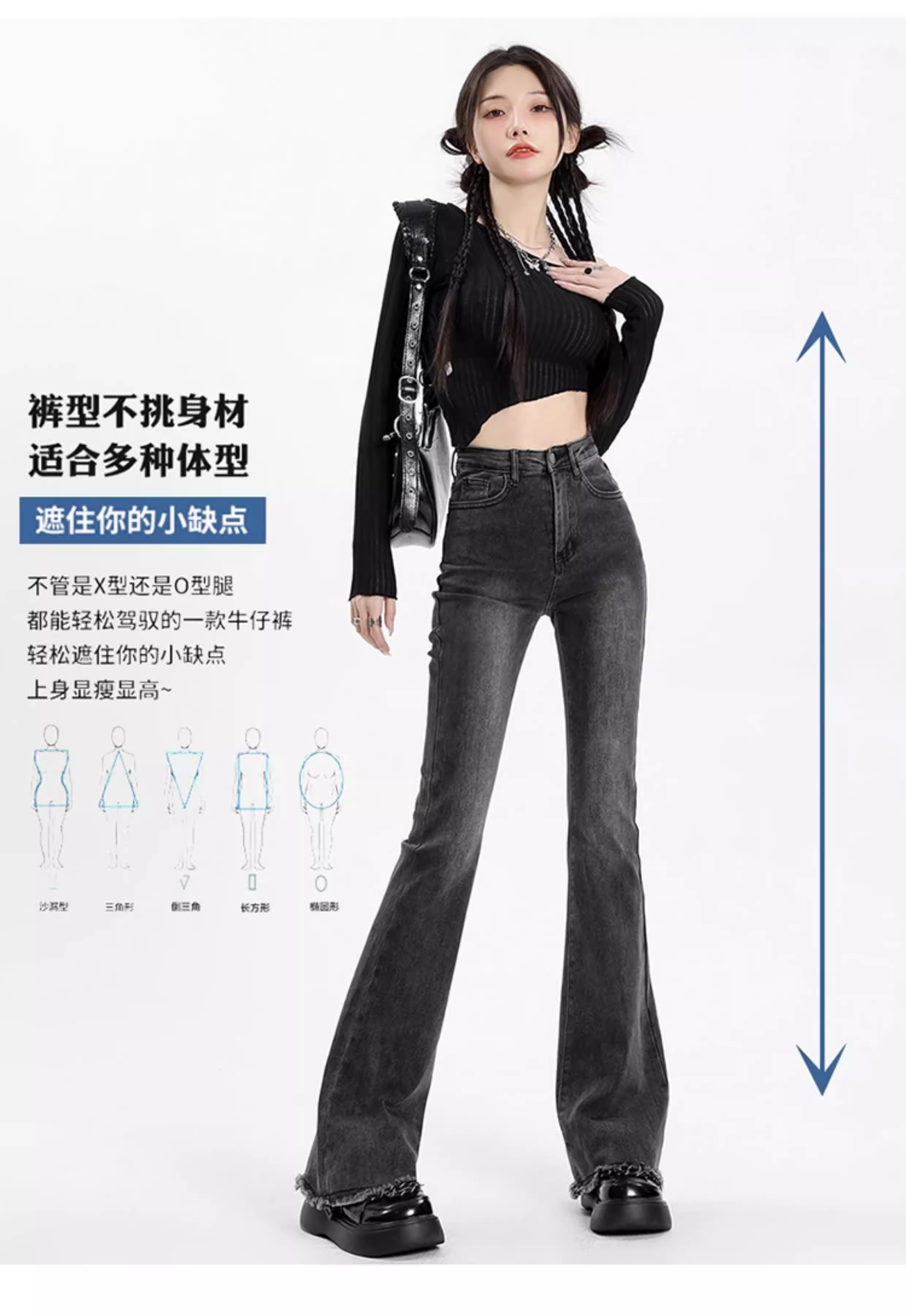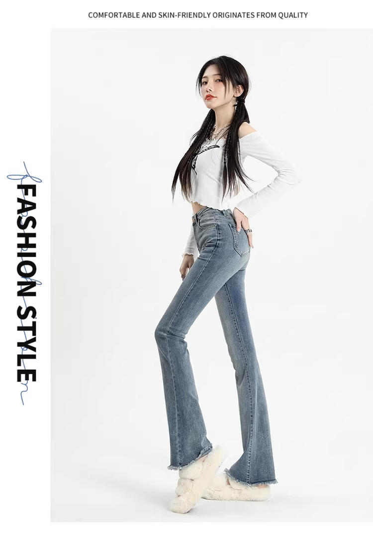 - Quần jean xám La Chapelle dáng loe dành cho nữ, mẫu mới xuân thu 2025, cạp cao, tôn dáng, viền xù, kiểu chuông dành cho người nhỏ nhắn.