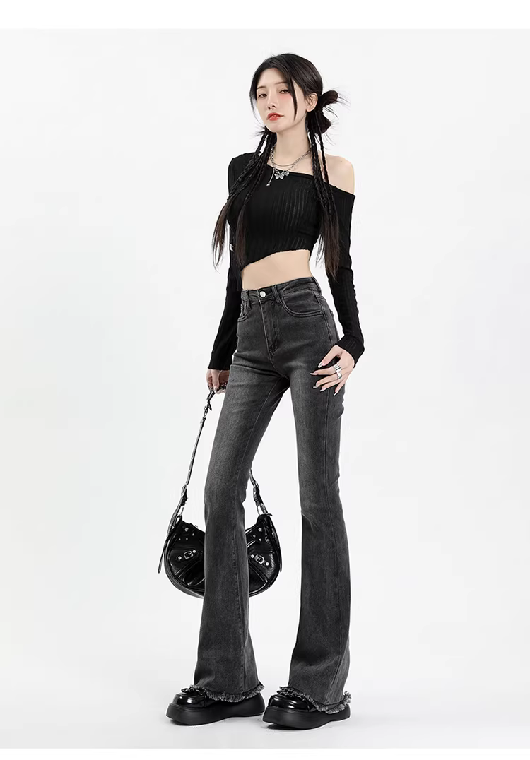 Quần jean xám La Chapelle dáng loe dành cho nữ, mẫu mới xuân thu 2025, cạp cao, tôn dáng, viền xù, kiểu chuông dành cho người nhỏ nhắn.