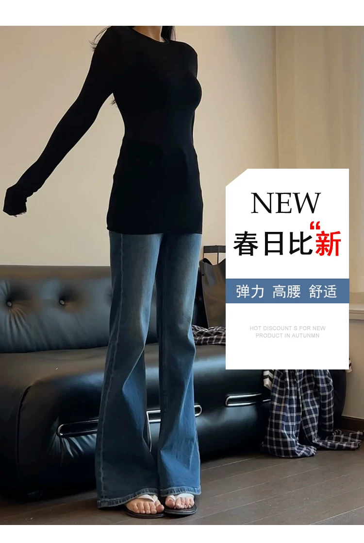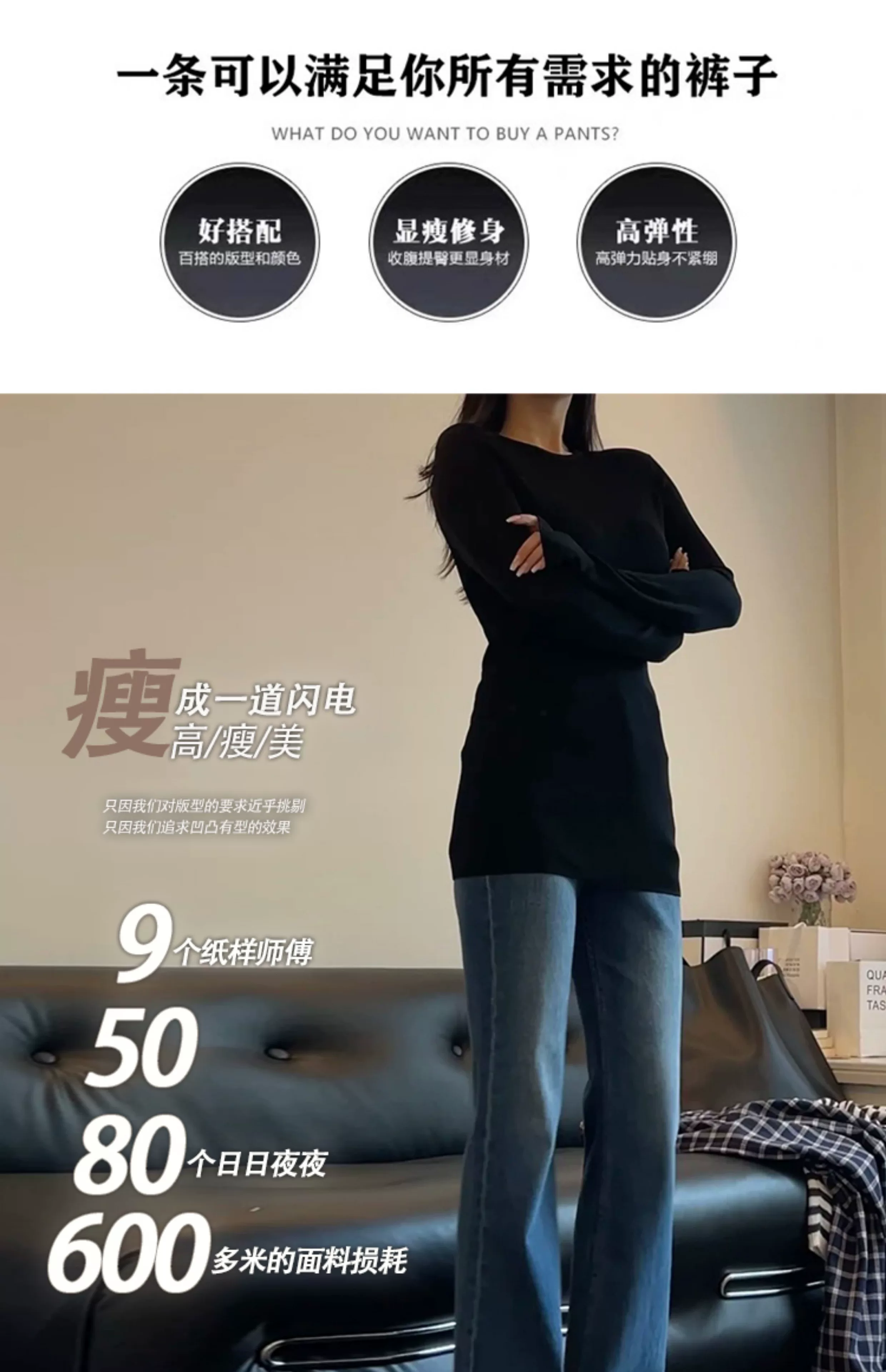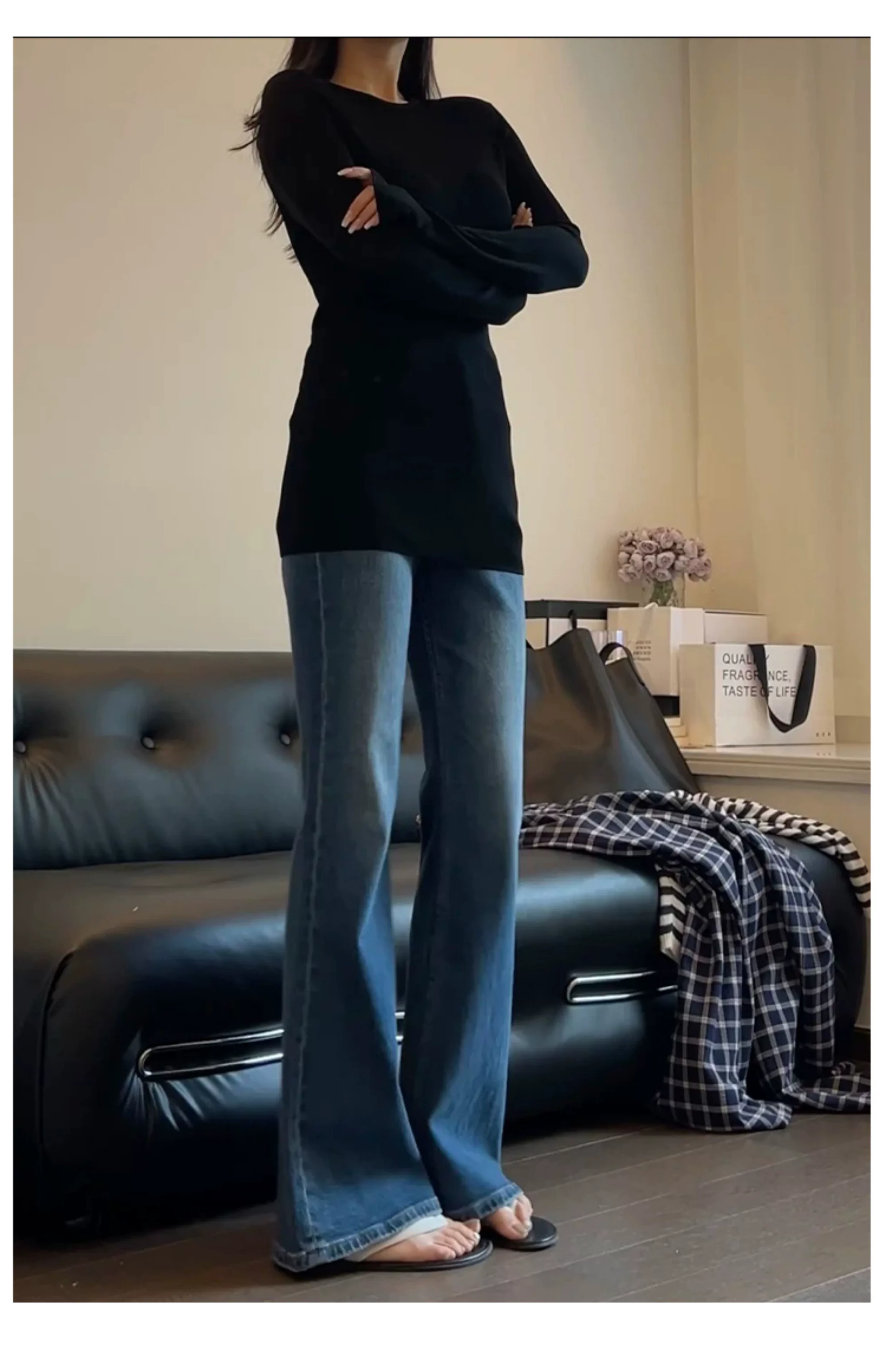 Quần jean xanh đậm cạp cao dáng loe nữ, kiểu mới thu đông 2025, size lớn, co giãn, che hông, quần chuông tôn dáng