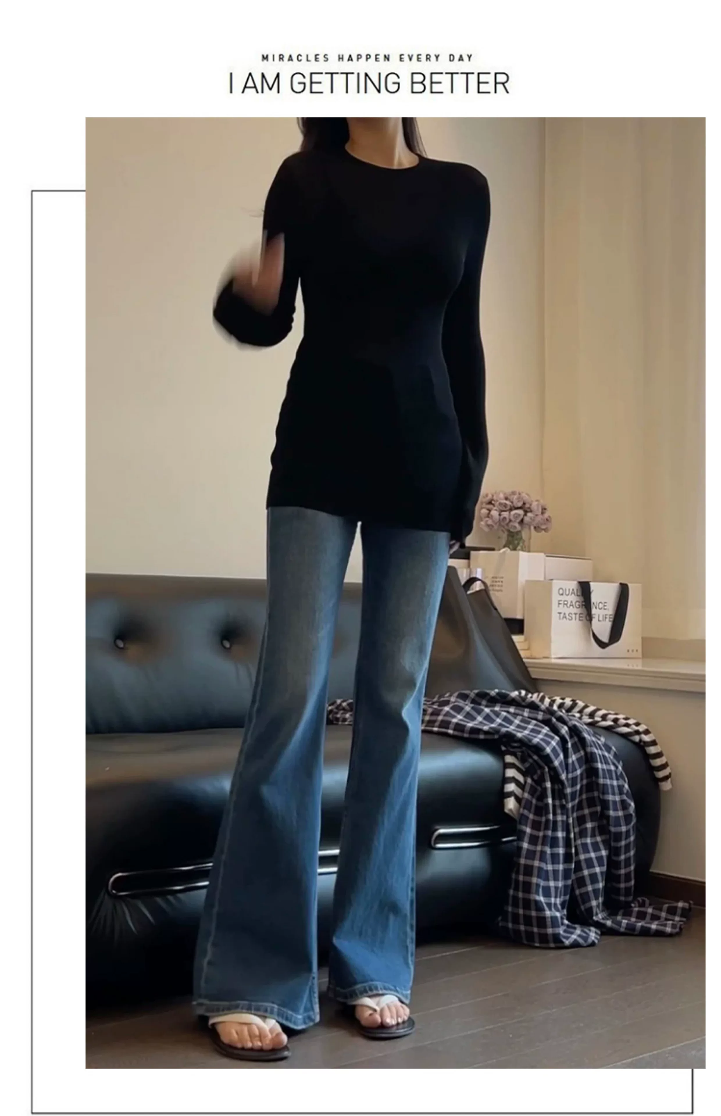 - Quần jean xanh đậm cạp cao dáng loe nữ, kiểu mới thu đông 2025, size lớn, co giãn, che hông, quần chuông tôn dáng