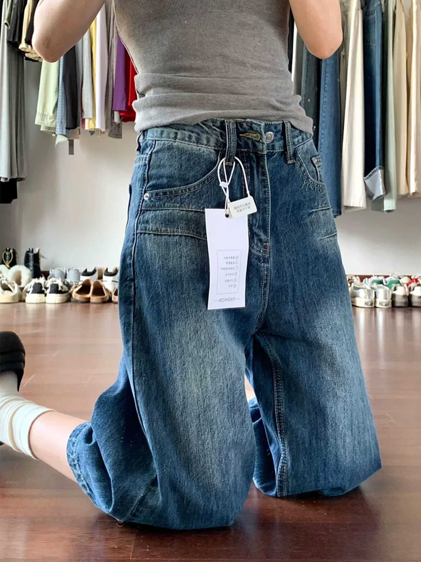 Quần jean xanh đậm dành cho nữ, cỡ lớn mùa hè, cạp cao, dáng rộng, tôn dáng, quần ống rộng dài vừa phải.