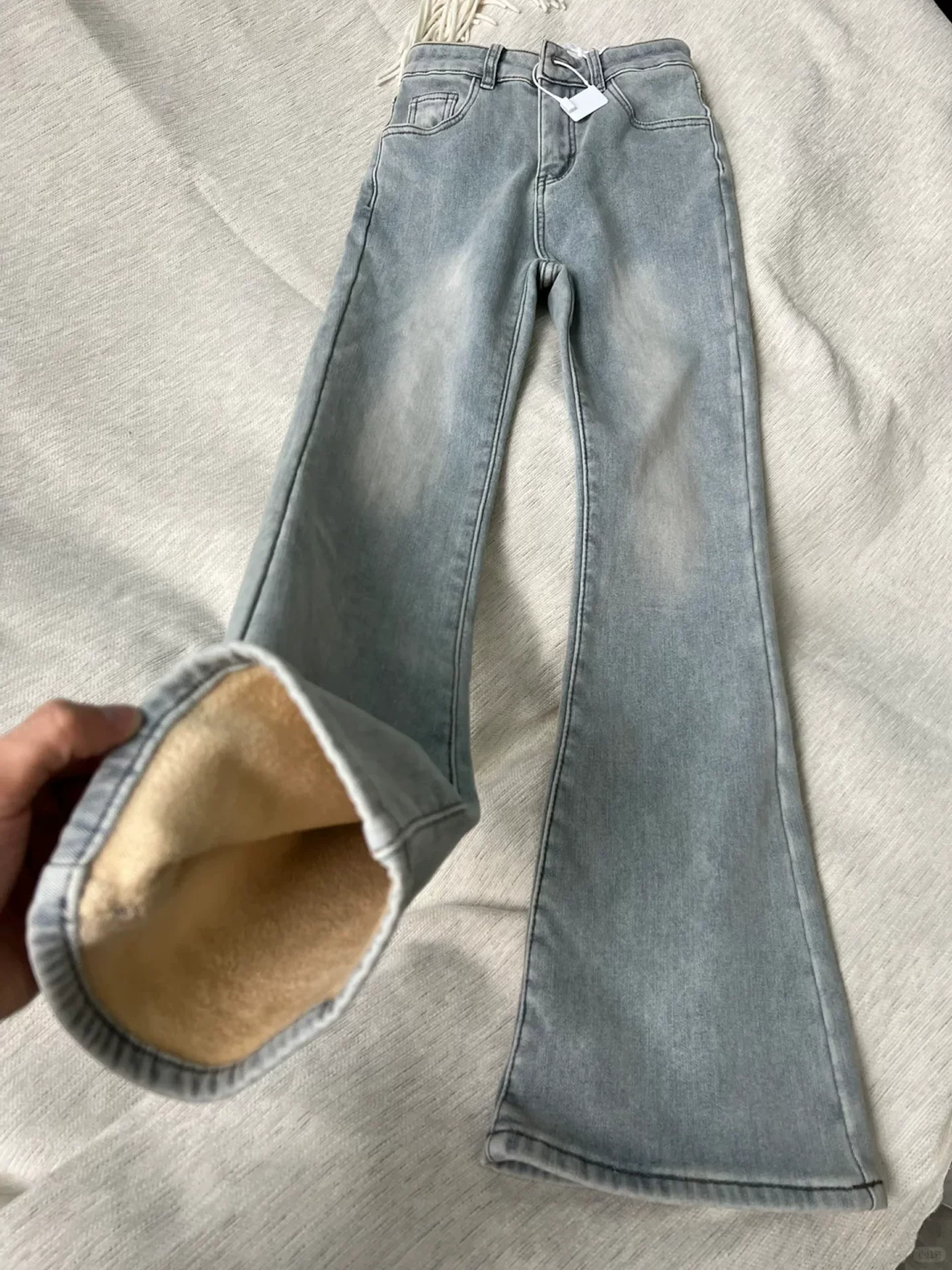 Quần jean xanh nhạt dáng loe dành cho nữ, mùa thu đông, cỡ lớn, lót lông cừu, dày dặn, cạp cao, co giãn, tôn dáng, quần ống loe