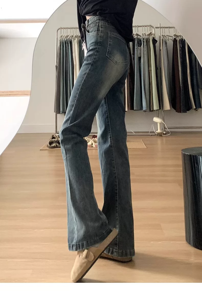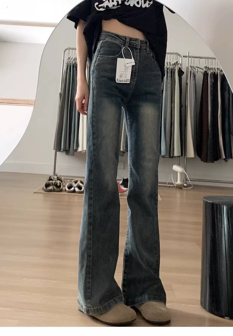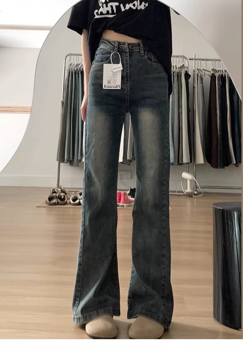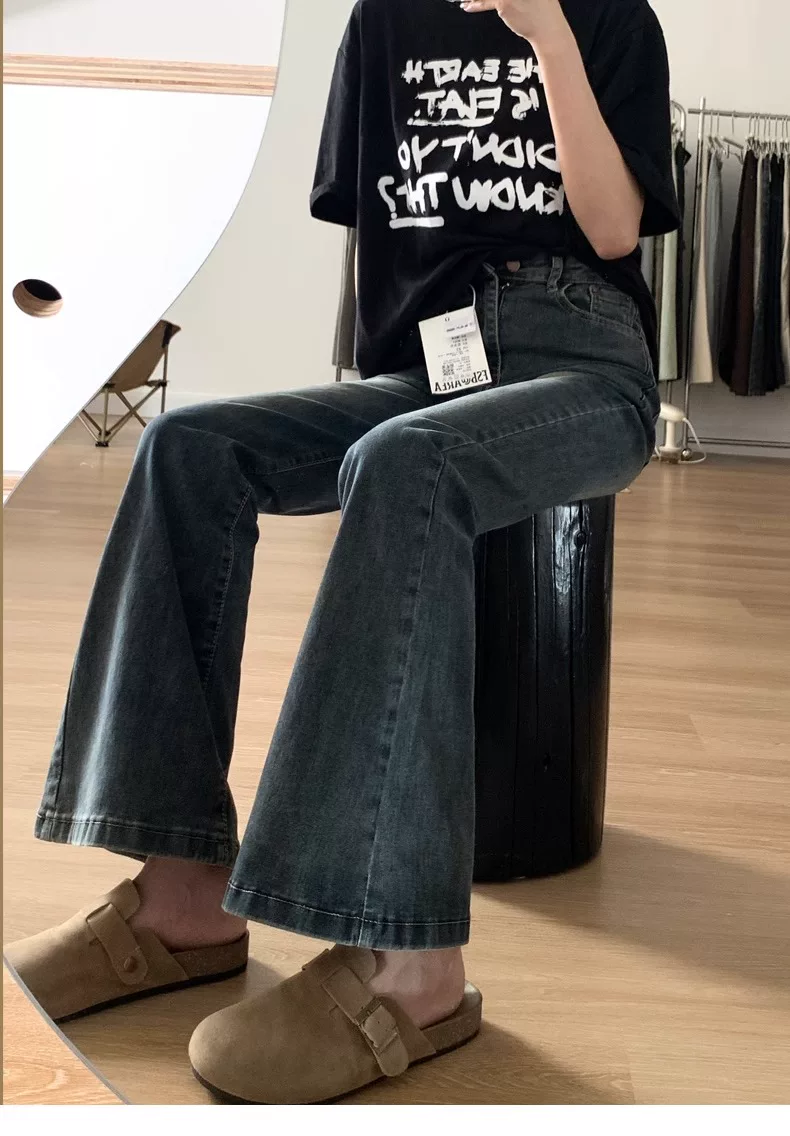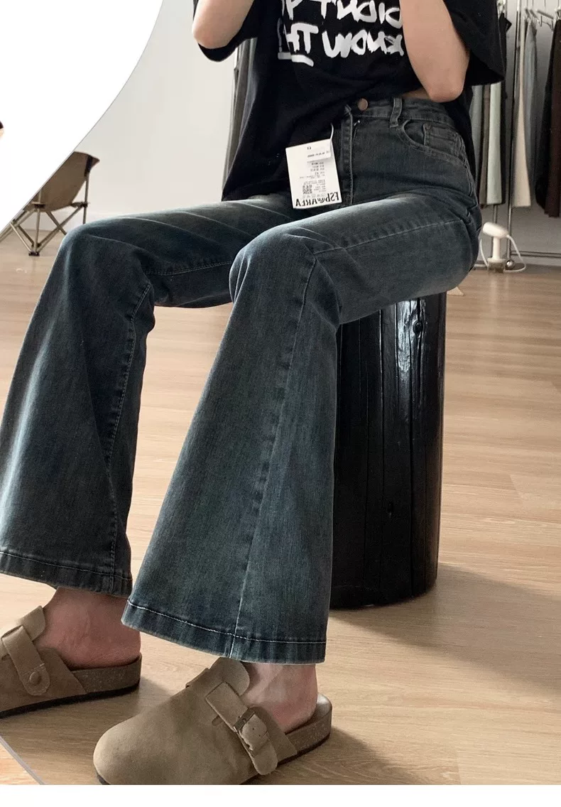 - Quần jean xòe màu xanh cổ điển dáng quả lê dành cho nữ phong cách đầu thu cỡ lớn quần ống rộng che hông cạp cao giảm béo