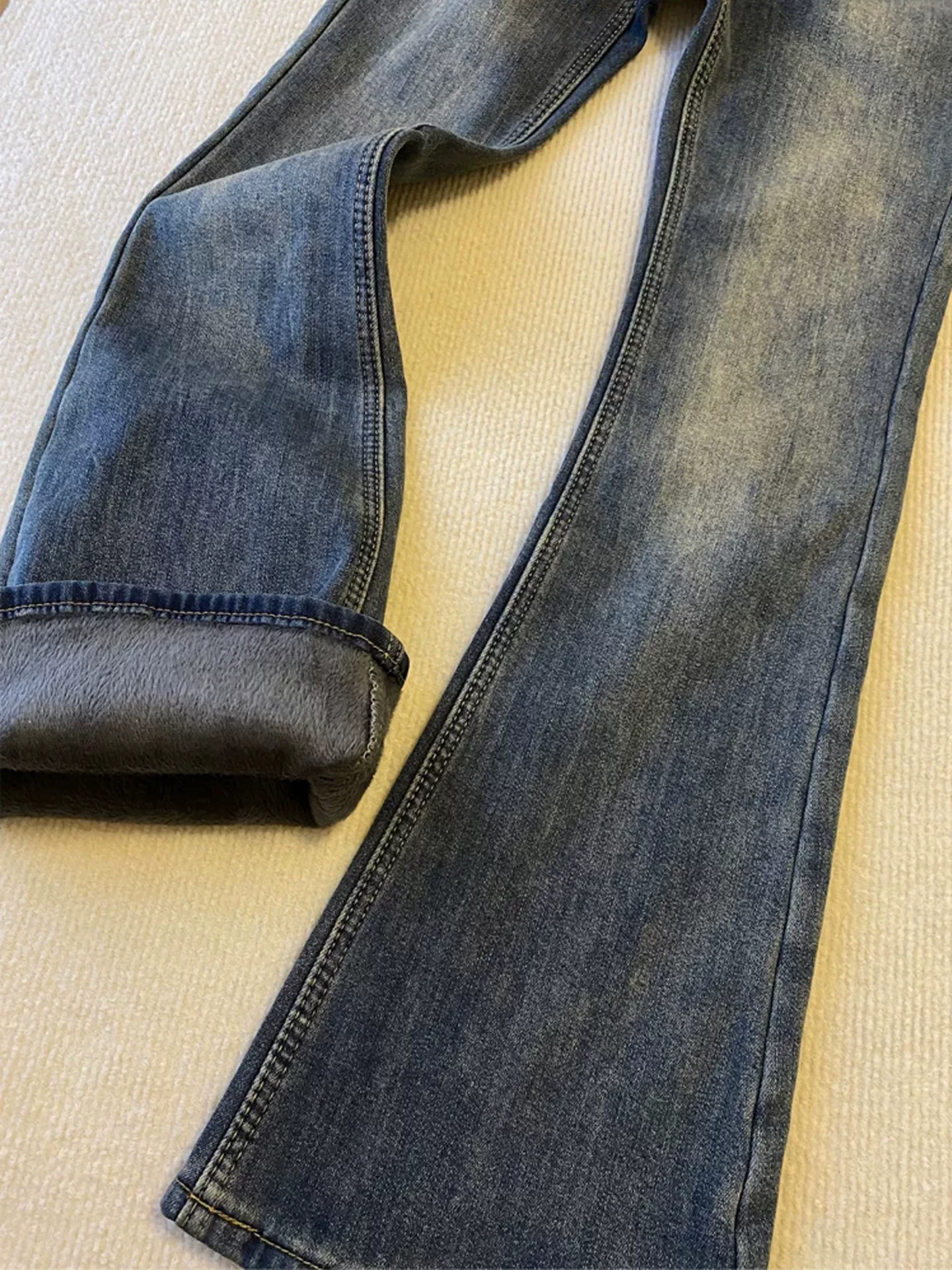 Quần jean xòe màu xanh cổ điển dành cho nữ, mùa thu đông, cỡ lớn, lót lông cừu, dày dặn, cạp cao, tôn dáng, co giãn, quần ống loe che hông.