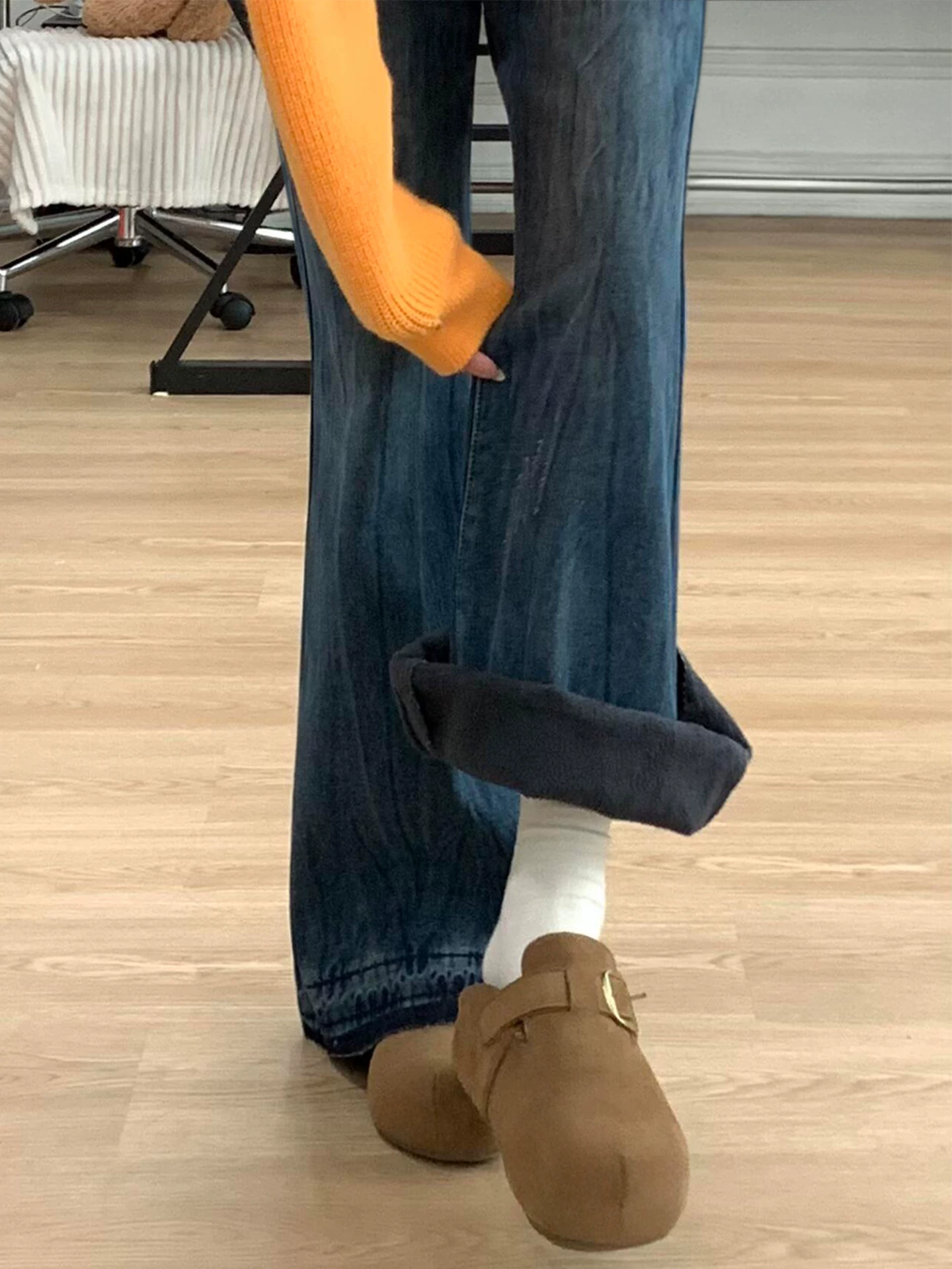 - Quần jean xòe màu xanh cổ điển dày dặn lót lông cừu dành cho nữ, kiểu dáng thu đông mới, cỡ lớn, lưng cao, tôn dáng, quần ống rộng.
