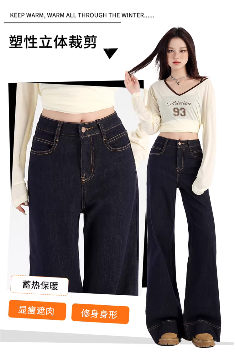 - Quần jean xòe màu xanh đậm lót lông cừu La Chapelle dành cho nữ, mùa thu đông 2025, kiểu mới cạp cao, không bó sát