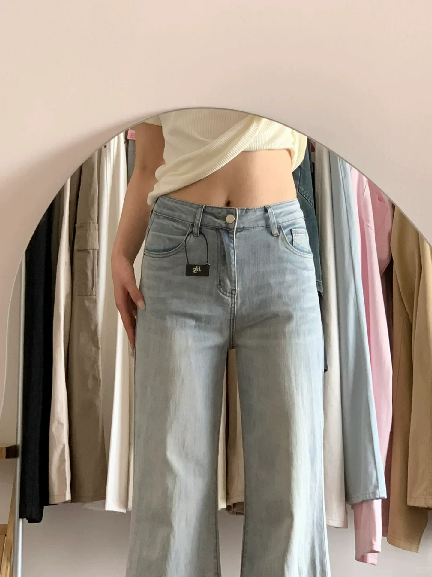 - Quần jean xòe màu xanh nhạt dành cho nữ, kiểu dáng mỏng mùa hè, cỡ lớn, lưng cao, co giãn, tôn dáng, không bó sát, quần ống chuông