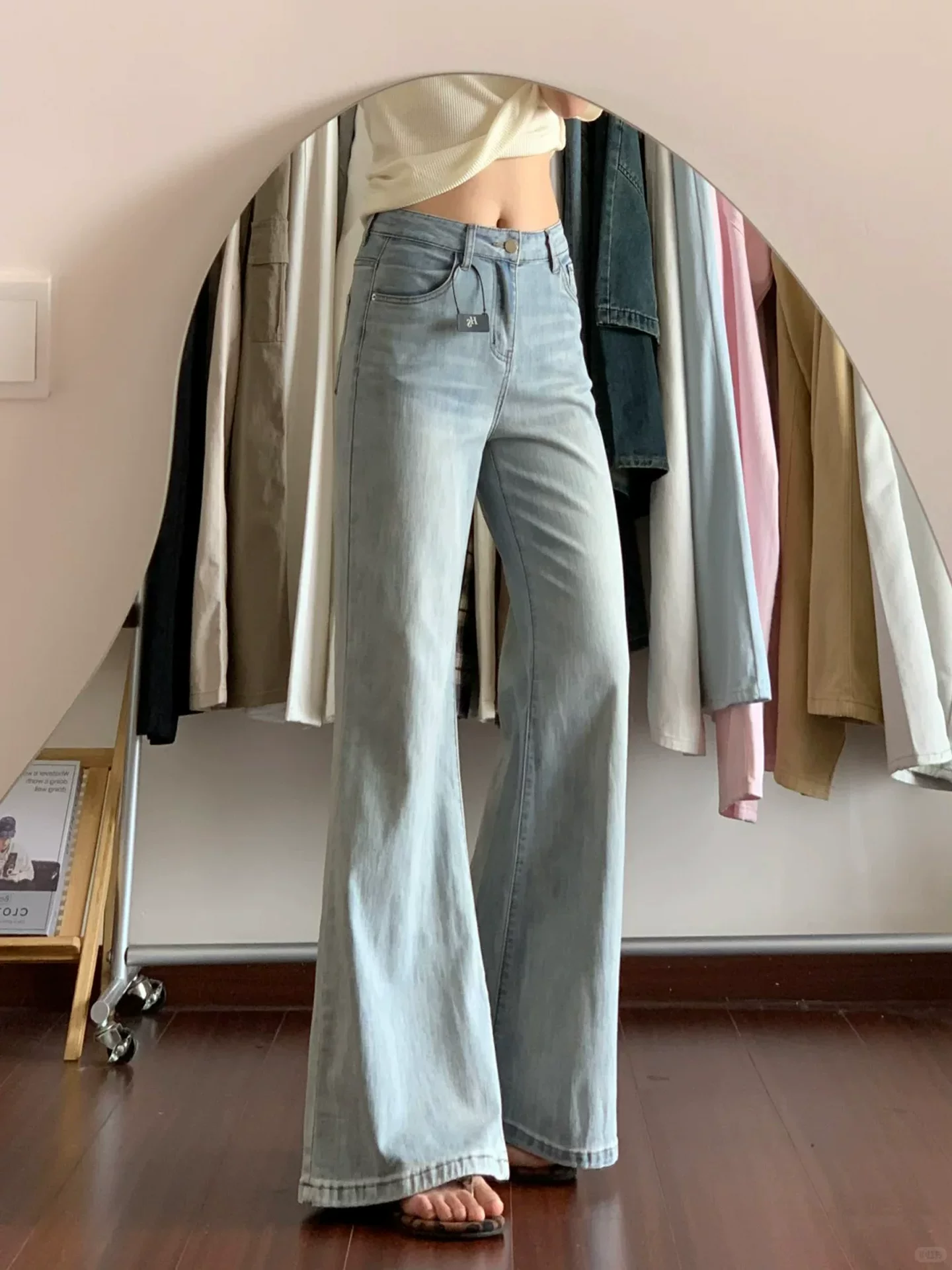 Quần jean xòe màu xanh nhạt dành cho nữ, kiểu dáng mỏng mùa hè, cỡ lớn, lưng cao, co giãn, tôn dáng, không bó sát, quần ống chuông