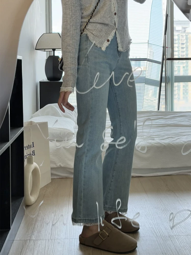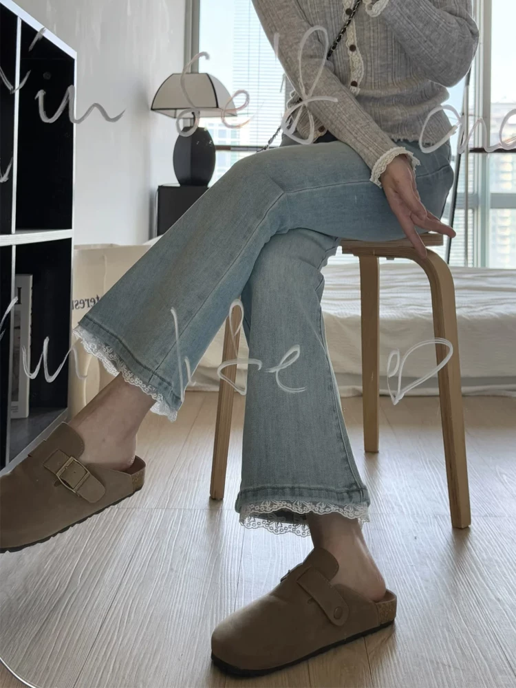 Quần jean xòe phối ren cổ điển dành cho nữ, phong cách xuân hè, cỡ lớn, eo cao, co giãn, tạo dáng thon gọn, quần xòe chín phần