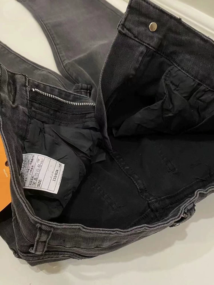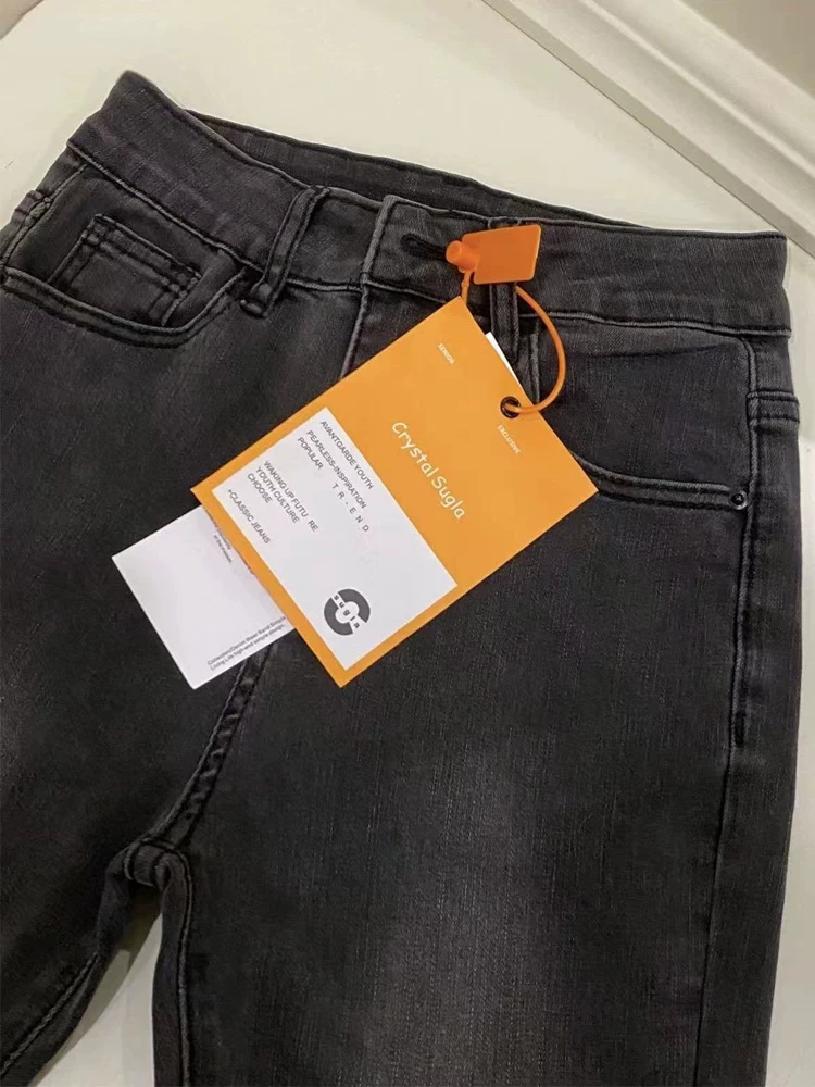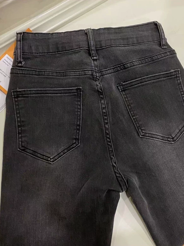- Quần jean xòe viền xù màu đen và xám dành cho nữ, kiểu dáng mùa thu mới, cỡ lớn, lưng cao, che hông, giảm béo, quần ống loe thẳng.