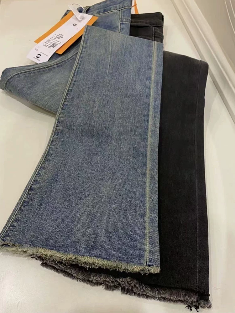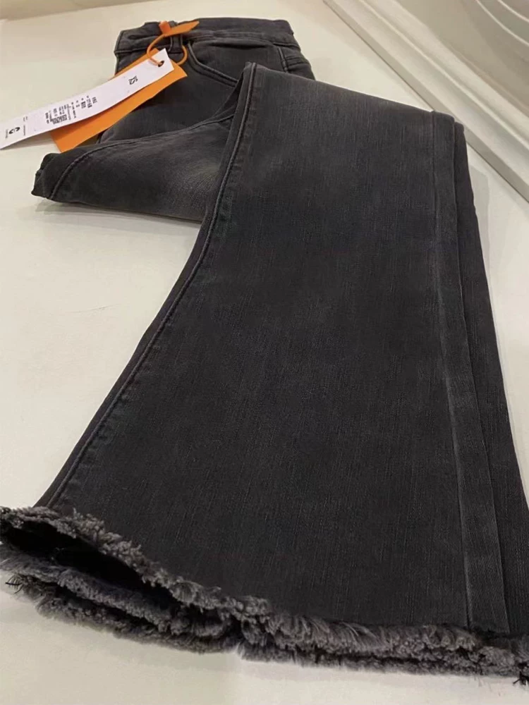 Quần jean xòe viền xù màu đen và xám dành cho nữ, kiểu dáng mùa thu mới, cỡ lớn, lưng cao, che hông, giảm béo, quần ống loe thẳng.