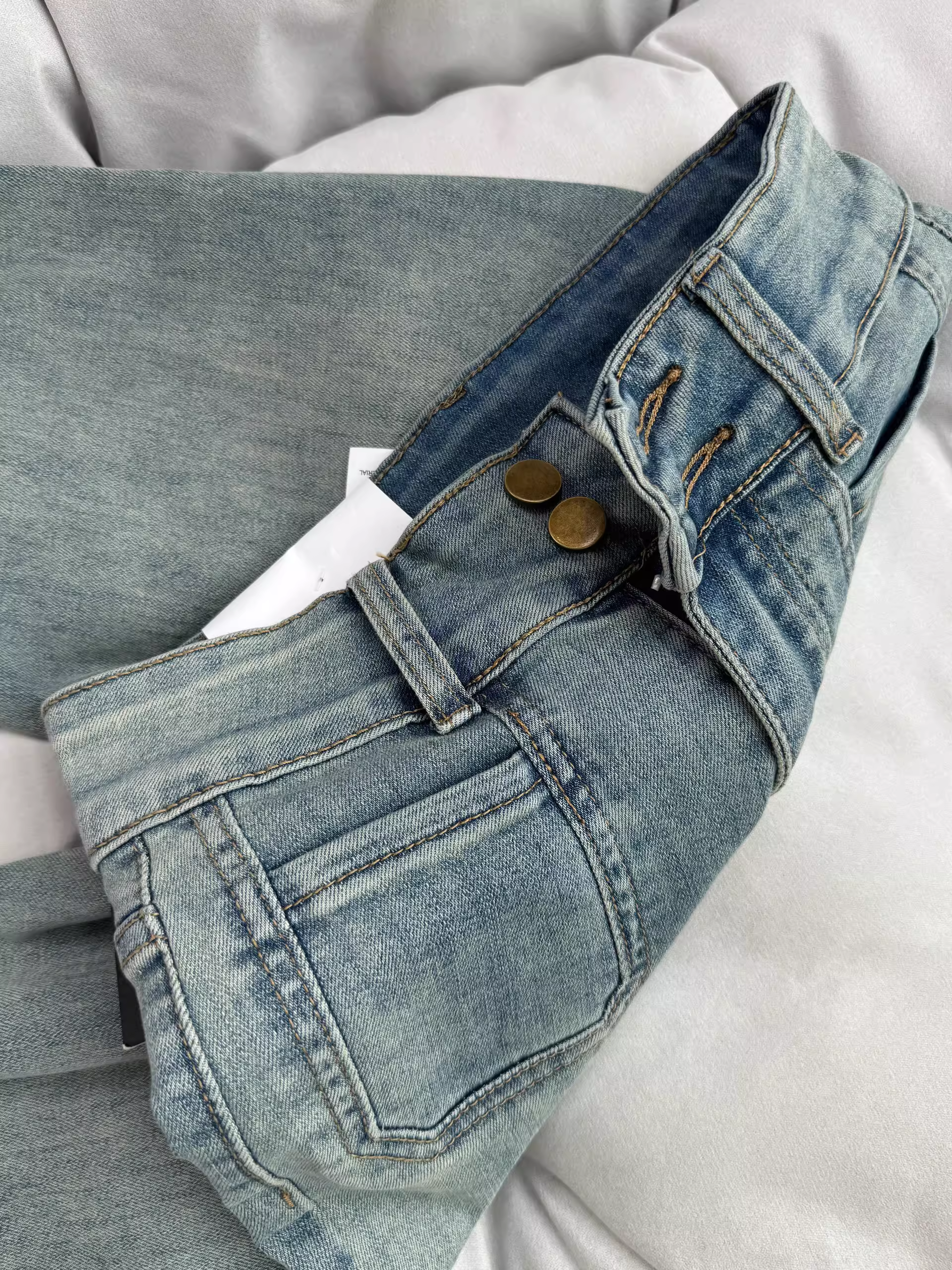 - Quần jeans dáng loe ôm body kiểu Mỹ La Chapelle dành cho nữ, mẫu mới thu 2025, cạp cao, co giãn, tôn dáng.
