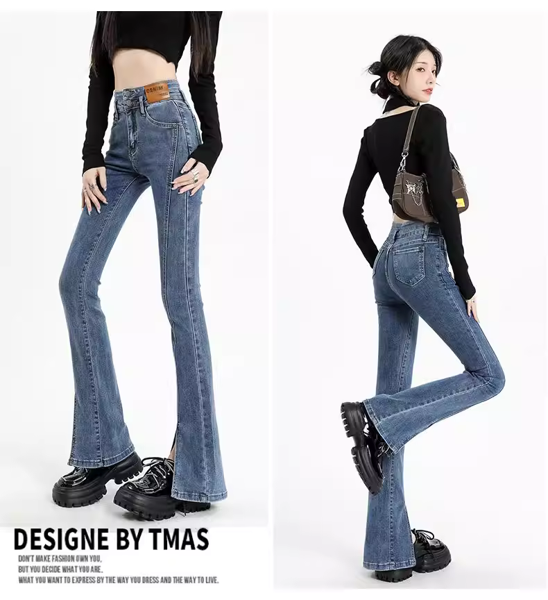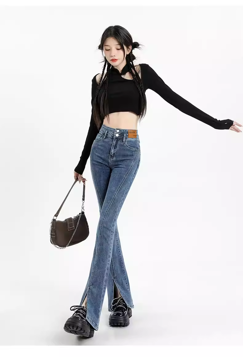 - Quần jeans đen La Chapelle dáng loe dành cho nữ, mẫu mới thu đông 2025, cạp cao, tôn dáng, xẻ tà, ôm sát, kiểu chuông