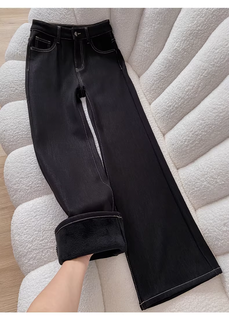 - Quần jeans đen La Chapelle dáng loe dày dặn dành cho nữ, mẫu mới thu đông 2025, lót lông, cạp cao, ống chuông