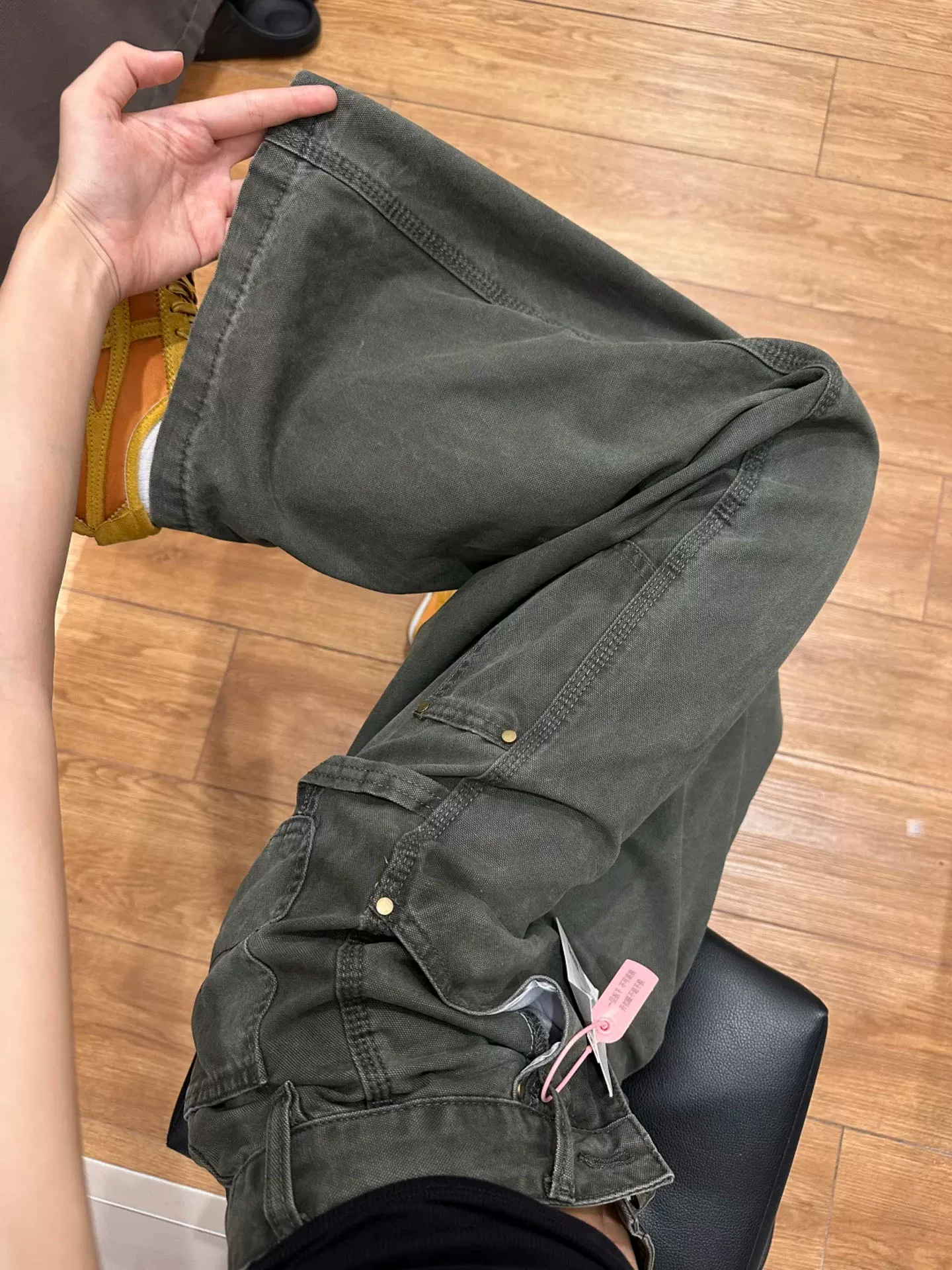- Quần jeans kiểu quân đội xanh retro Mỹ dành cho nữ, thu đông 2025, size lớn, cạp cao, dáng rộng, tôn dáng
