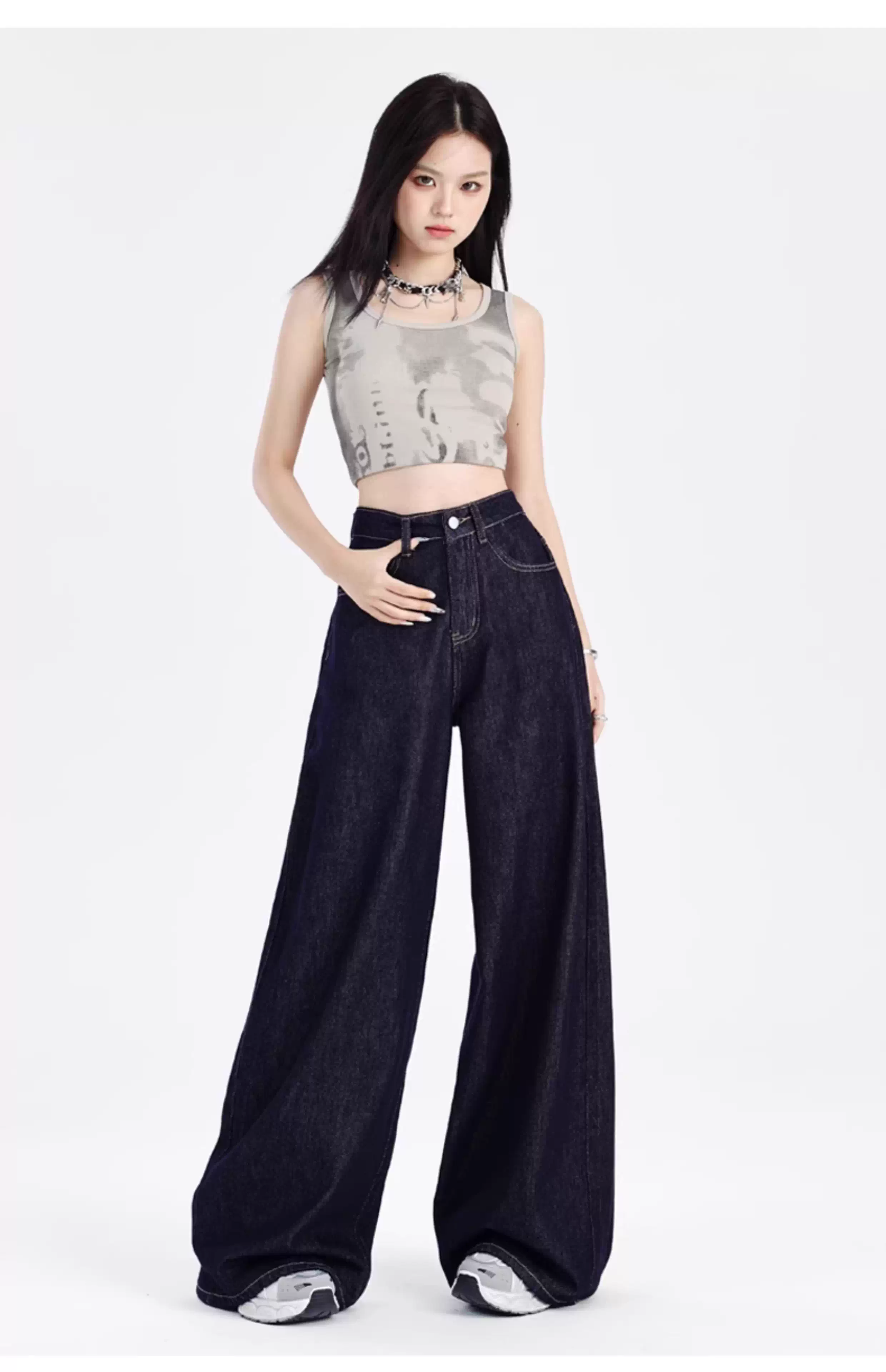 Quần jeans La Chapelle cạp cao ống rộng dành cho nữ, kiểu mới thu đông 2025, màu xanh đậm, chất liệu lót lông mềm mại, dài chấm đất