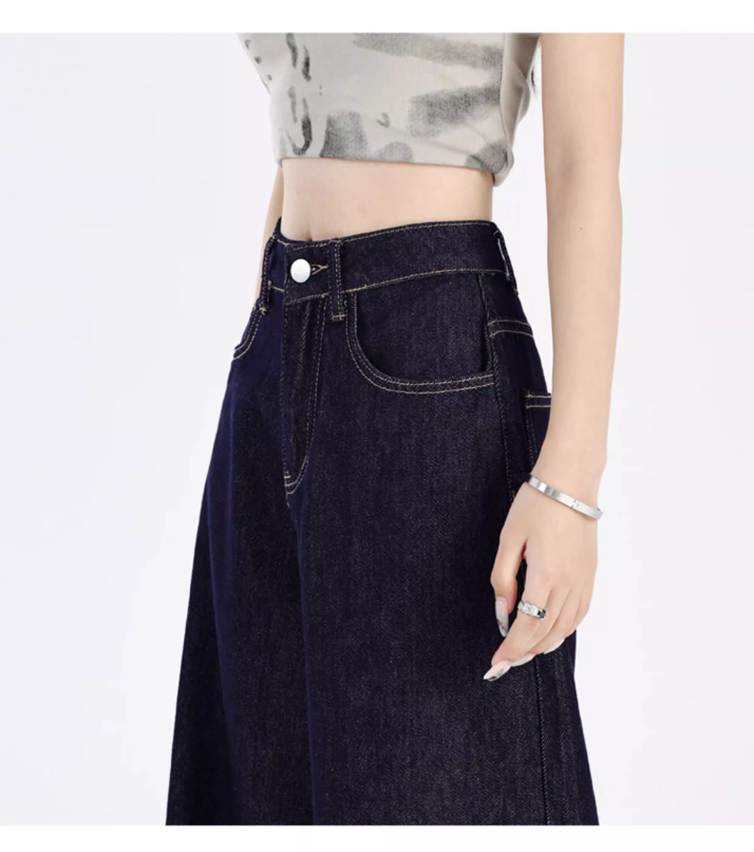 - Quần jeans La Chapelle cạp cao ống rộng dành cho nữ, kiểu mới thu đông 2025, màu xanh đậm, chất liệu lót lông mềm mại, dài chấm đất