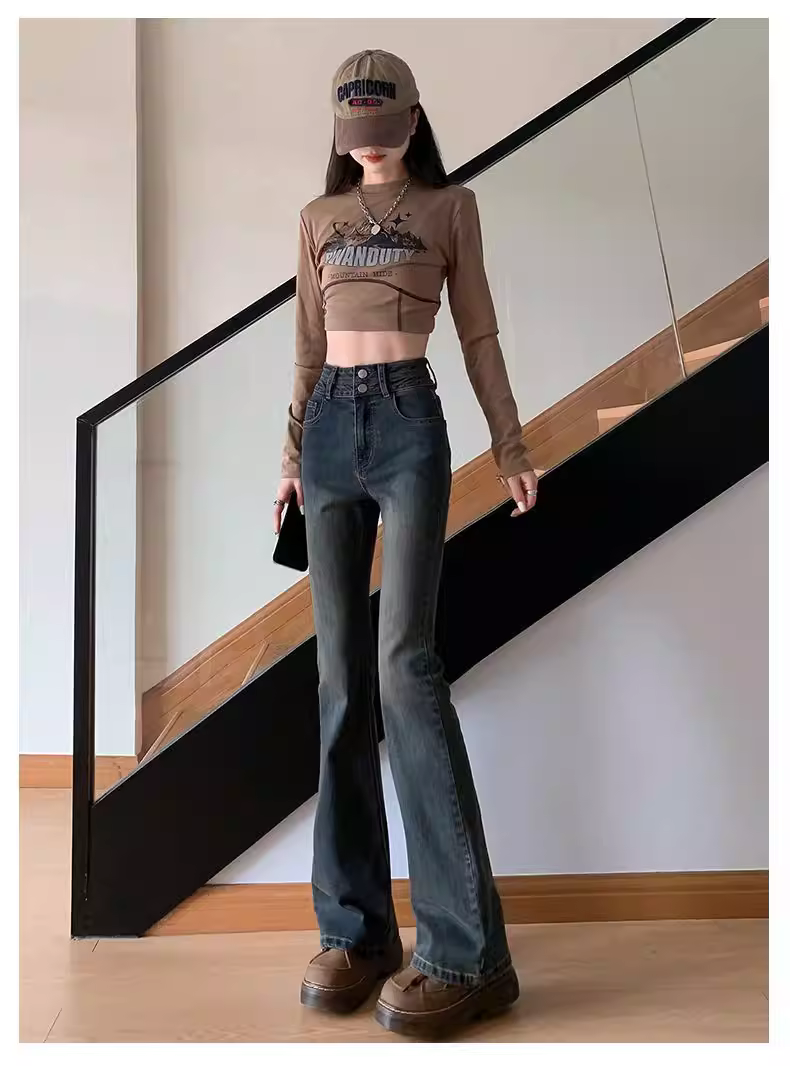 - Quần jeans nữ La Chapelle kiểu dáng retro, lót lông dày, ống loe, mùa thu đông 2025, cạp cao, kiểu dáng Mỹ.