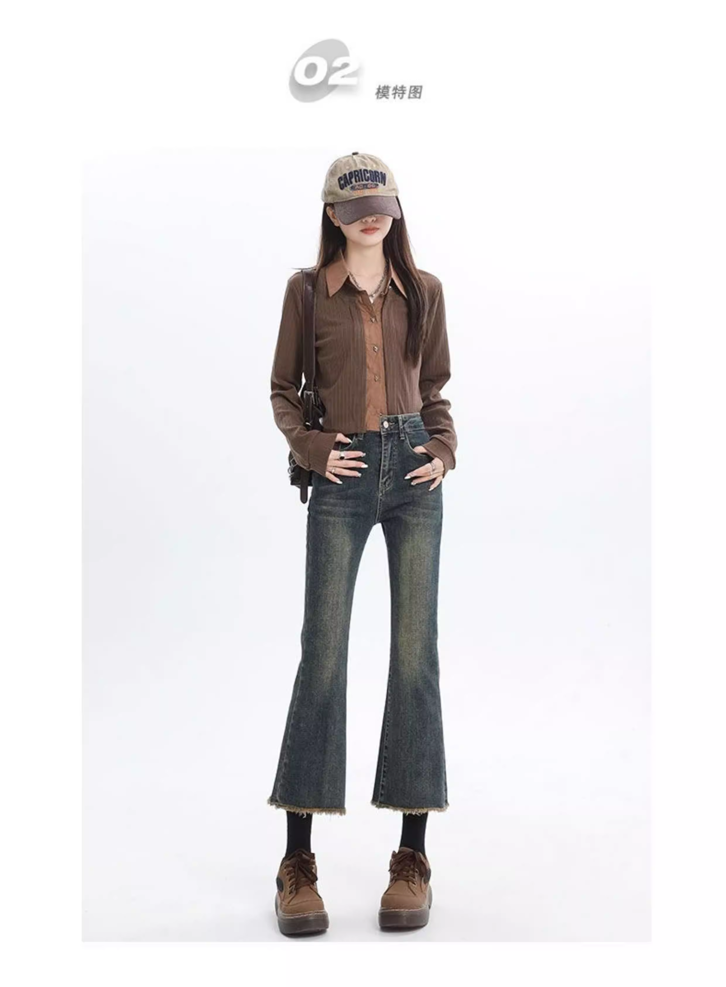 - Quần jeans nữ La Chapelle kiểu dáng retro, ống loe, cạp cao, lót lông, viền xù, mùa thu đông 2025
