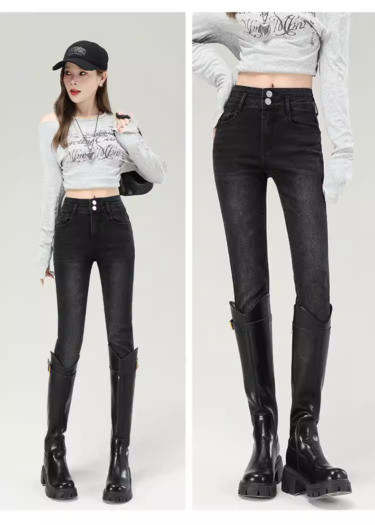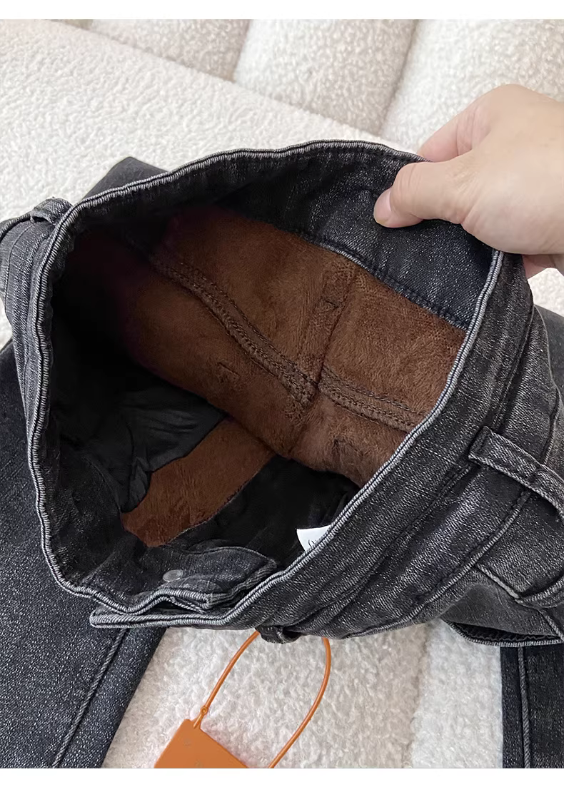 Quần jeans nữ La Chapelle lót lông dày, dáng ôm, cạp cao, kiểu dáng bút chì, mới thu đông 2025